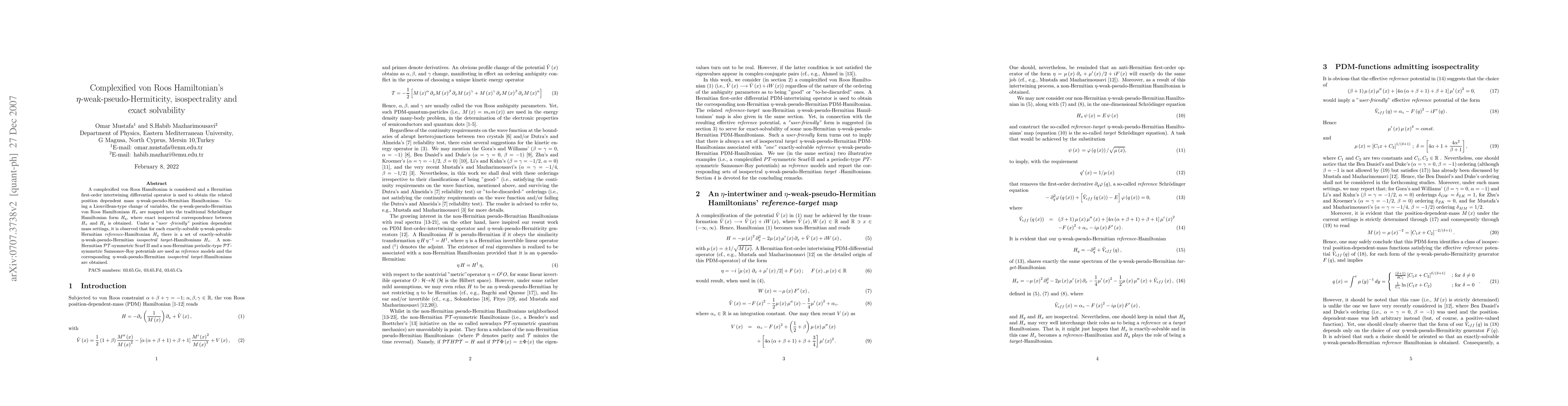 This research explores $\eta$-weak-pseudo-Hermitian properties of a complexified von Roos Hamiltonian, revealing exact isospectrality between $\eta$-weak-pseudo-Hermitian Hamiltonians and traditional Schrödinger Hamiltonians through a Liouvillean-type change of variables. It demonstrates exact solvability for both the reference and isospectral target Hamiltonians, exemplified by PT-symmetric Scarf II and Samsonov-Roy potentials.
