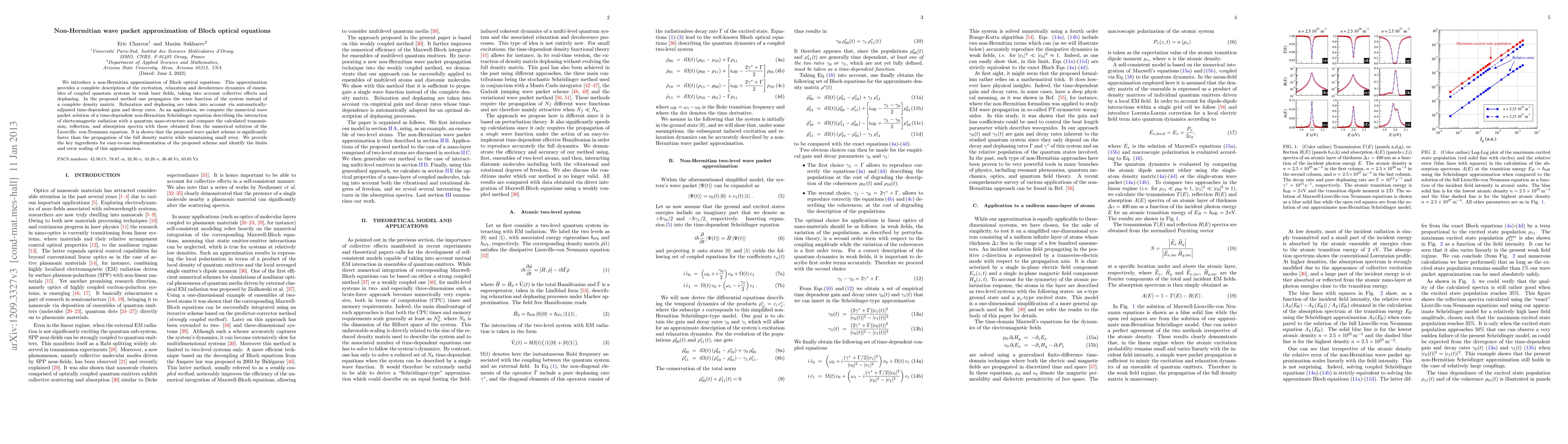 We introduce a non-Hermitian approximation of Bloch optical equations. This approximation provides a complete description of the excitation, relaxation and decoherence dynamics of ensembles of coupled quantum systems in weak laser fields, taking into account collective effects and dephasing. In the proposed method one propagates the wave function of the system instead of a complete density matrix. Relaxation and dephasing are taken into account via automatically-adjusted time-dependent gain and decay rates. As an application, we compute the numerical wave packet solution of a time-dependent non-Hermitian Schrodinger equation describing the interaction of electromagnetic radiation with a quantum nano-structure and compare the calculated transmission, reflection, and absorption spectra with those obtained from the numerical solution of the Liouville- von-Neumann equation. It is shown that the proposed wave packet scheme is significantly faster than the propagation of the full density matrix while maintaining small error. We provide the key ingredients for easy-to-use implementation of the proposed scheme and identify the limits and error scaling of this approximation.