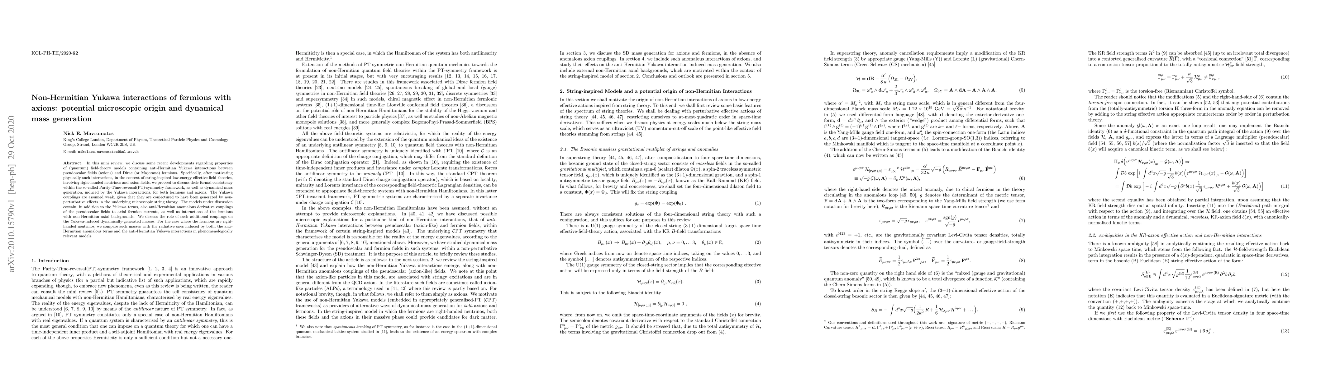 In this mini review, we discuss some recent developments regarding properties of (quantum) field-theory models containing anti-Hermitian Yukawa interactions between pseudoscalar fields (axions) and Dirac (or Majorana) fermions. Specifically, after motivating physically such interactions, in the context of string-inspired low-energy effective field theories, involving right-handed neutrinos and axion fields, we proceed to discuss their formal consistency within the so-called Parity-Time-reversal(PT)-symmetry framework, as well as dynamical mass generation, induced by the Yukawa interactions, for both fermions and axions. The Yukawa couplings are assumed weak, given that they are conjectured to have been generated by non-perturbative effects in the underlying microscopic string theory. The models under discussion contain, in addition to the Yukawa terms, also anti-Hermitian anomalous derivative couplings of the pseudoscalar fields to axial fermion currents, as well as interactions of the fermions with non-Hermitian axial backgrounds. We discuss the role of such additional couplings on the Yukawa-induced dynamically-generated masses. For the case where the fermions are right-handed neutrinos, we compare such masses with the radiative ones induced by both, the anti-Hermitian anomalous terms and the anti-Hermitian Yukawa interactions in phenomenologically relevant models.