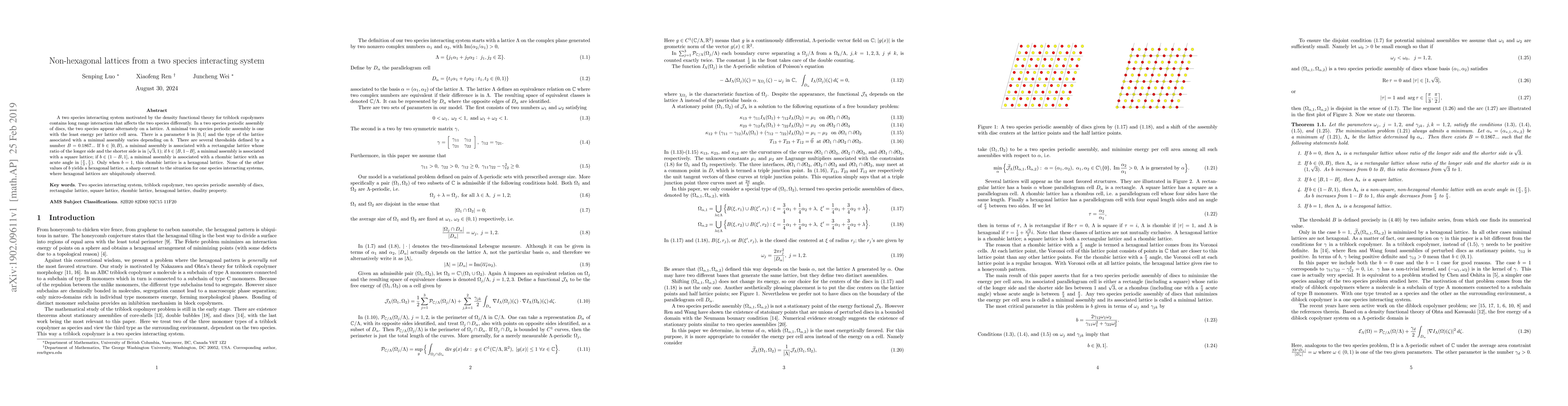 A two-species interacting system creates non-hexagonal lattices with varying side ratios depending on a parameter b, differing from one species systems where hexagons are common.