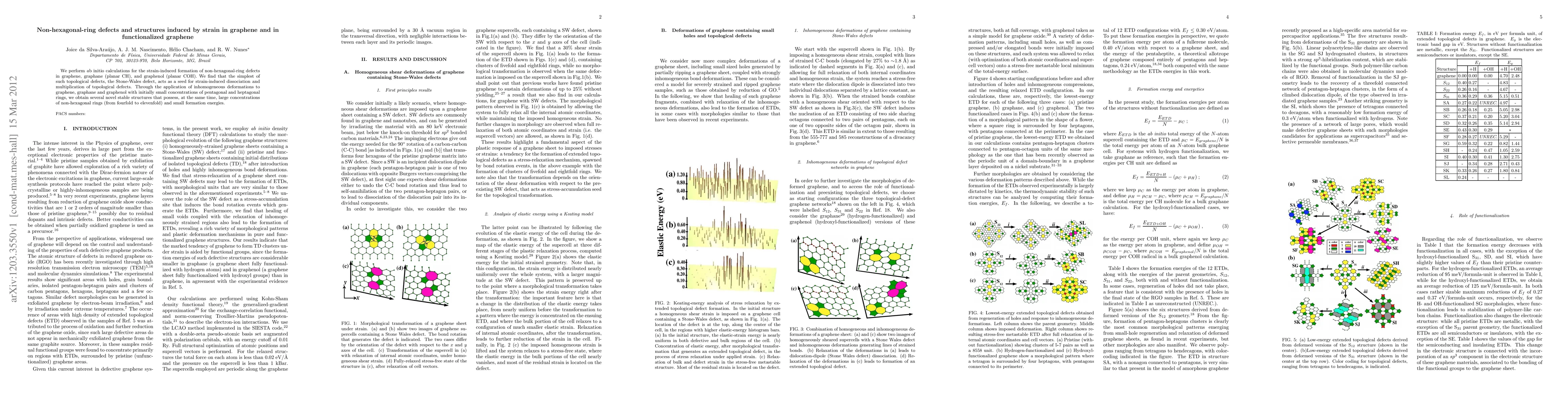 This paper uses {\textit ab initio} calculations to study how strain induces non-hexagonal-ring defects in graphene, graphane, and graphenol, revealing that the Stone-Wales defect facilitates the formation of various stable structures with high concentrations of non-hexagonal rings and low formation energies.