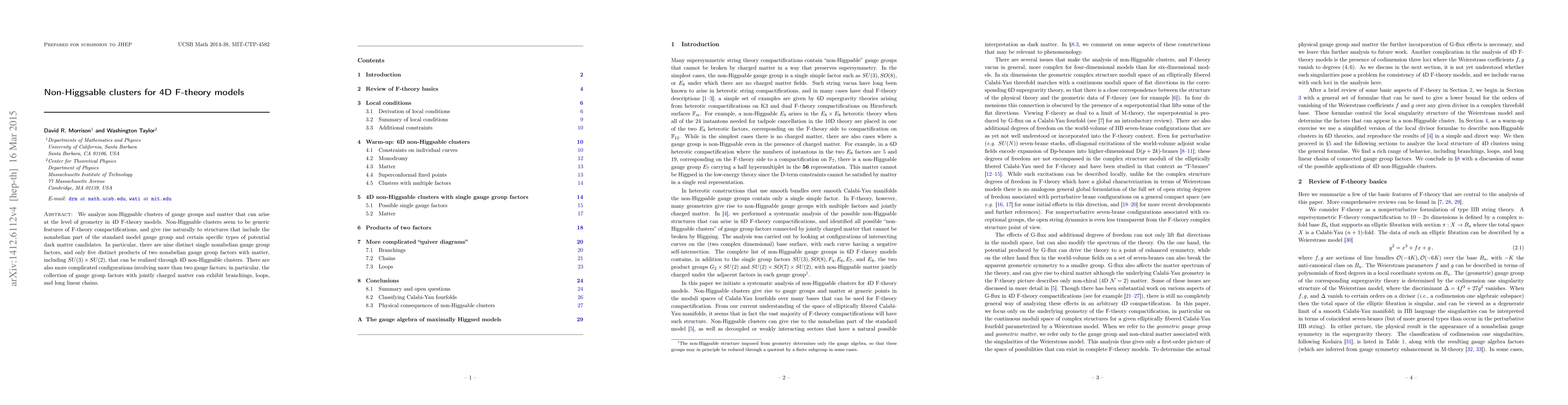This paper investigates non-Higgsable clusters in 4D F-theory models that lead to specific gauge groups and matter configurations, including the nonabelian part of the standard model and potential dark matter candidates. Nine single nonabelian gauge groups and five combinations of two such groups with matter are identified as realizable through these clusters.