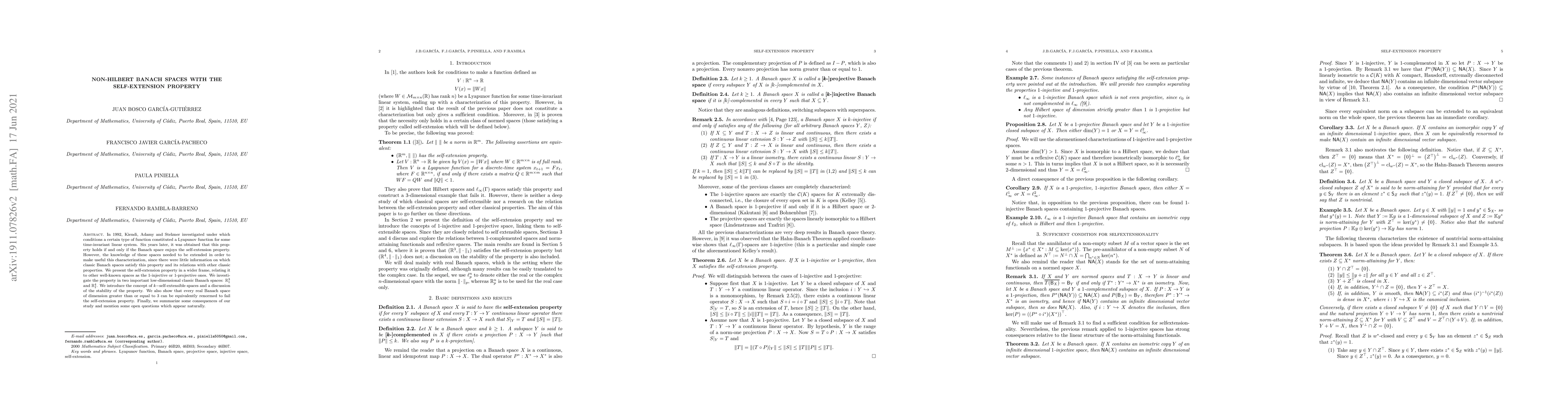 In 1992, Kiendi, Adamy and Stelzner investigated under which conditions a certain type of function constituted a Lyapunov function for some time-invariant linear system. Six years later, it was obtained that this property holds if and only if the Banach space enjoys the self-extension property. However, the knowledge of these spaces needed to be extended in order to make useful this characterization, since there were little information on which classic Banach spaces satisfy this property and its relations with other classic properties. We present the self-extension property in a wider frame, relating it to other well-known spaces as the $1$-injective or $1$-projective ones. We investigate the property in two important low-dimensional classic Banach spaces: $\mathbb{R}_1^3$ and $\mathbb{R}_1^4$. We introduce the concept of $k-$self-extensible spaces and a discussion of the stability of the property. We also show that every real Banach space of dimension greater than or equal to $3$ can be equivalently renormed to fail the self-extension property. Finally, we summarize some consequences of our study and mention some open questions which appear naturally.