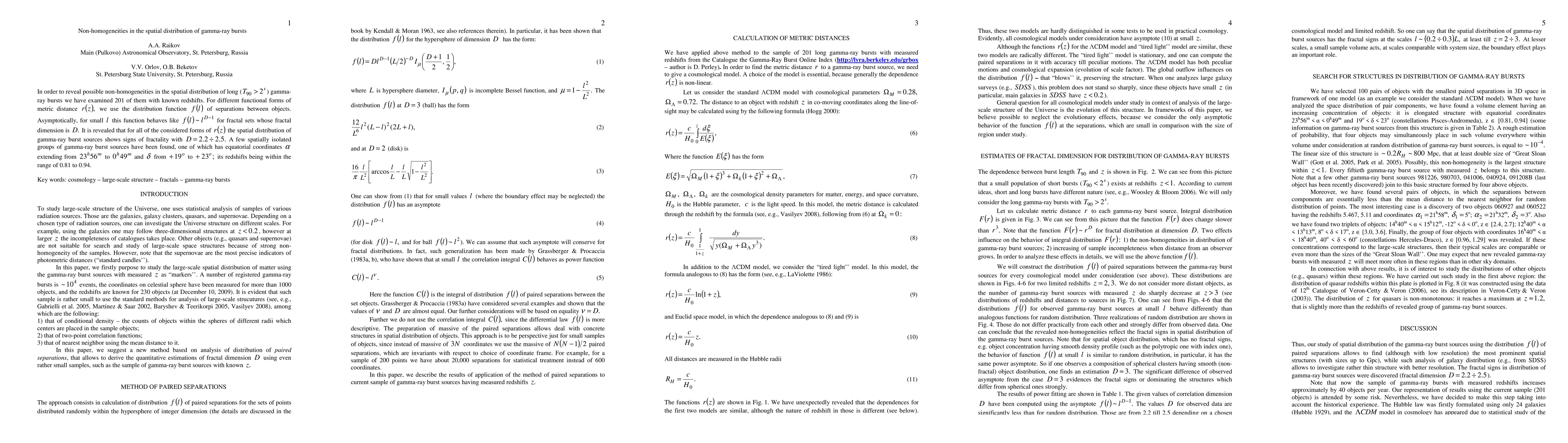 In order to reveal possible non-homogeneities in the spatial distribution of long (T_90 > 2^s) gamma-ray bursts we have examined 201 of them with known redshifts z. For different functional forms of metric distance r(z)we use the distribution function f(l)of separations between objects. Asymptotically, for small l this function behaves like f(l)~l^{D-1} for fractal sets whose fractal dimension is D. It is revealed that for all of the considered forms of r(z) the spatial distribution of gamma-ray burst sources shows signs of fractality with D=2.2-2.5. A few spatially isolated groups of gamma-ray burst sources have been found, one of which has equatorial coordinates alpha extending from 23^h 56^m to 0^h 49^m and delta from +19^o to +23^o its redshifts being within the range of 0.81 to 0.94.