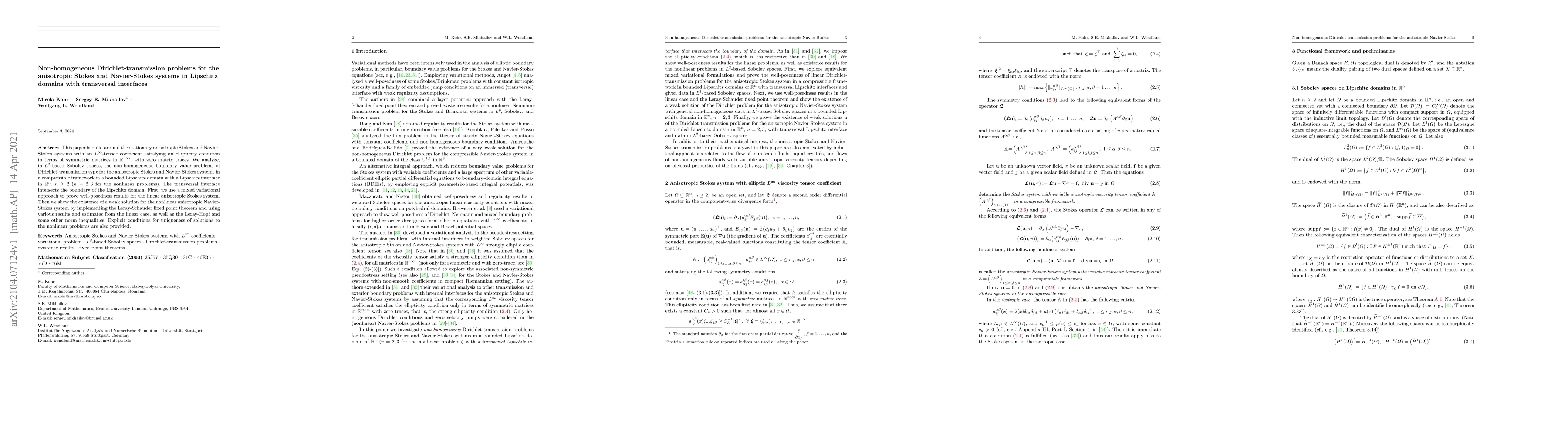 This paper investigates non-homogeneous Dirichlet-transmission problems for anisotropic Stokes and Navier-Stokes systems with a focus on compressible frameworks in bounded Lipschitz domains with transversal interfaces.