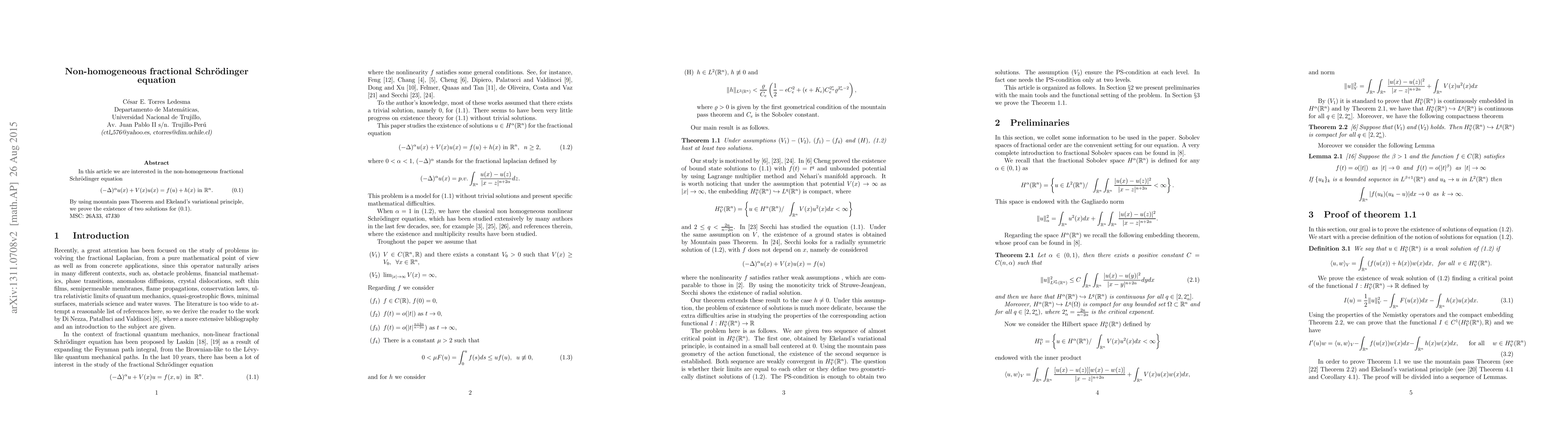 In this article we are interested on the non-homogeneous fractional Schr\"odinger equation \begin{eqnarray}\label{eq00} &(-\Delta)^{\alpha}u(x) + V(x)u(x) = f(u) + h(x) \mbox{ in } \mathbb{R}^{n}. \end{eqnarray} By using mountain pass Thoerem and Ekeland's variational principle, we prove the existence of two nontrivial solutions for (\ref{eq00}).