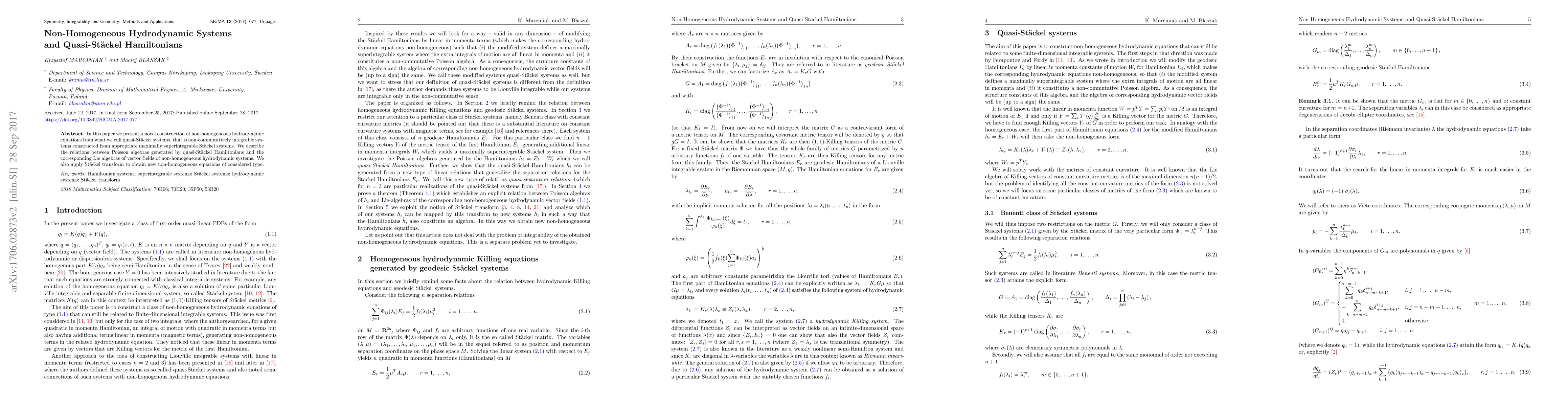In this paper we present a novel construction of non-homogeneous hydrodynamic equations from what we call quasi-St\"ackel systems, that is non-commutatively integrable systems constructed from appropriate maximally superintegrable St\"ackel systems. We describe the relations between Poisson algebras generated by quasi-St\"ackel Hamiltonians and the corresponding Lie algebras of vector fields of non-homogeneous hydrodynamic systems. We also apply St\"ackel transform to obtain new non-homogeneous equations of considered type.