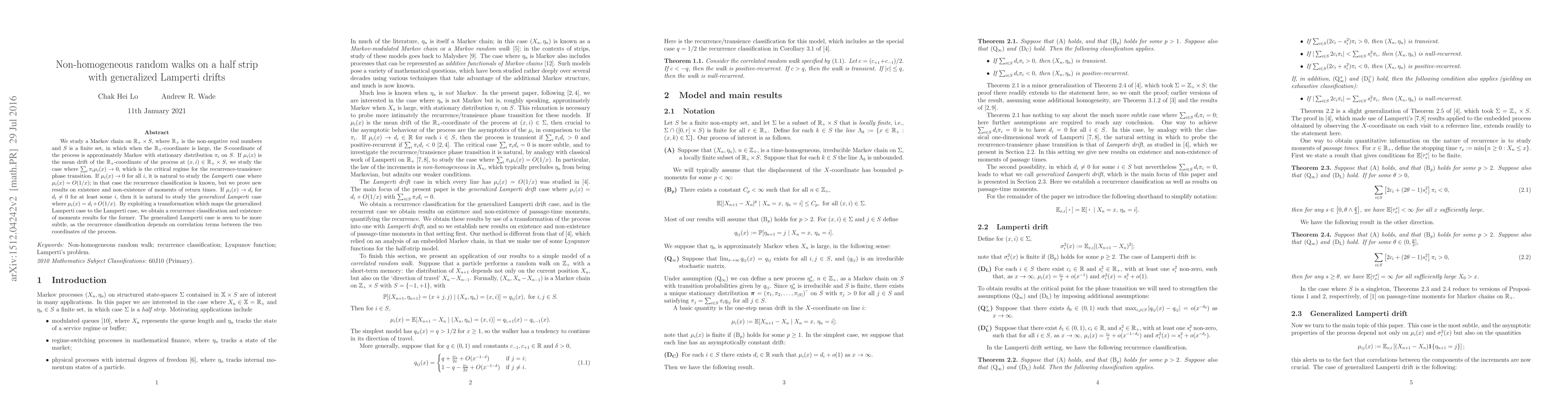 We study a Markov chain on $\mathbb{R}_+ \times S$, where $\mathbb{R}_+$ is the non-negative real numbers and $S$ is a finite set, in which when the $\mathbb{R}_+$-coordinate is large, the $S$-coordinate of the process is approximately Markov with stationary distribution $\pi_i$ on $S$. If $\mu_i(x)$ is the mean drift of the $\mathbb{R}_+$-coordinate of the process at $(x,i) \in \mathbb{R}_+ \times S$, we study the case where $\sum_{i} \pi_i \mu_i (x) \to 0$, which is the critical regime for the recurrence-transience phase transition. If $\mu_i(x) \to 0$ for all $i$, it is natural to study the Lamperti case where $\mu_i(x) = O(1/x)$; in that case the recurrence classification is known, but we prove new results on existence and non-existence of moments of return times. If $\mu_i (x) \to d_i$ for $d_i \neq 0$ for at least some $i$, then it is natural to study the generalized Lamperti case where $\mu_i (x) = d_i + O (1/x)$. By exploiting a transformation which maps the generalized Lamperti case to the Lamperti case, we obtain a recurrence classification and existence of moments results for the former. The generalized Lamperti case is seen to be more subtle, as the recurrence classification depends on correlation terms between the two coordinates of the process.