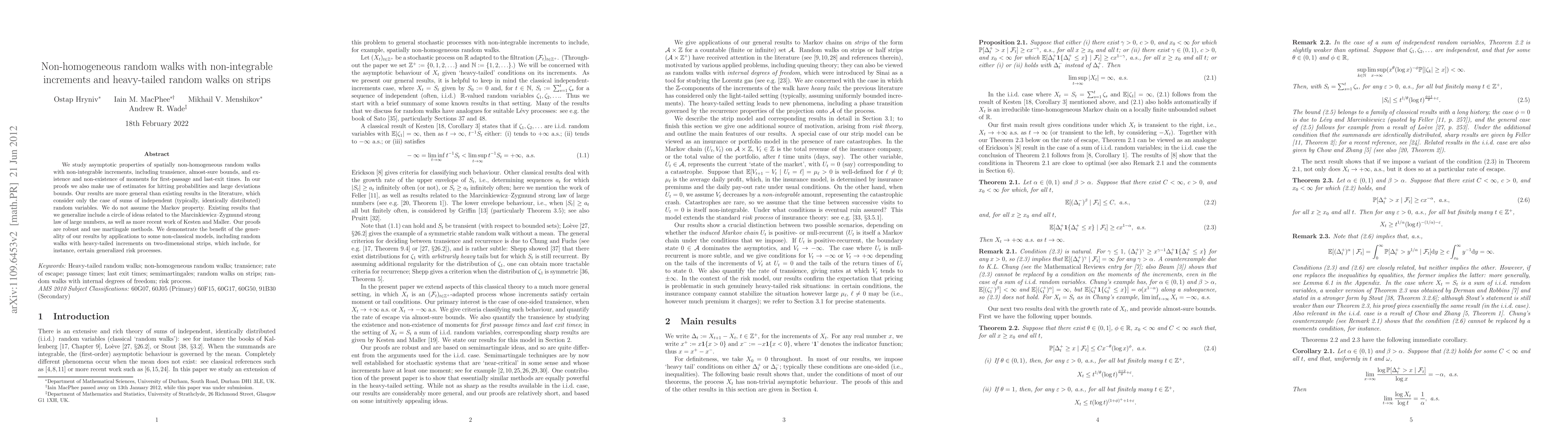 This paper investigates the asymptotic properties of non-homogeneous random walks with non-integrable increments, focusing on transience and moment existence for first-passage and last-exit times. The authors generalize existing results and apply their robust martingale-based proofs to non-classical models, including heavy-tailed random walks on two-dimensional strips.