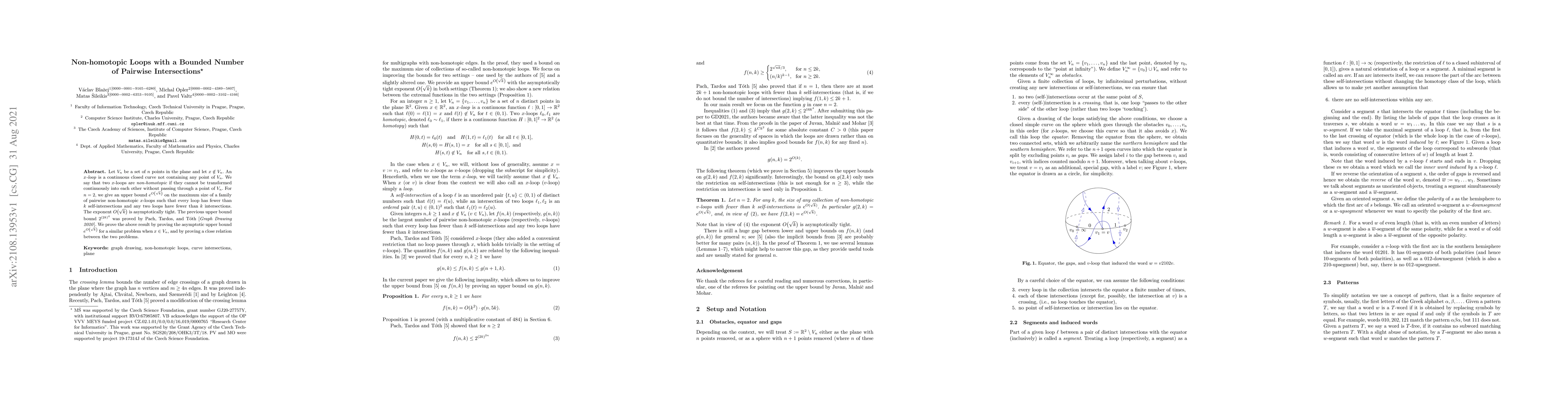 Let $V_n$ be a set of $n$ points in the plane and let $x \notin V_n$. An $x$-loop is a continuous closed curve not containing any point of $V_n$. We say that two $x$-loops are non-homotopic if they cannot be transformed continuously into each other without passing through a point of $V_n$. For $n=2$, we give an upper bound $e^{O\left(\sqrt{k}\right)}$ on the maximum size of a family of pairwise non-homotopic $x$-loops such that every loop has fewer than $k$ self-intersections and any two loops have fewer than $k$ intersections. The exponent $O\big(\sqrt{k}\big)$ is asymptotically tight. The previous upper bound bound $2^{(2k)^4}$ was proved by Pach, Tardos, and T\'oth [Graph Drawing 2020]. We prove the above result by proving the asymptotic upper bound $e^{O\left(\sqrt{k}\right)}$ for a similar problem when $x \in V_n$, and by proving a close relation between the two problems.