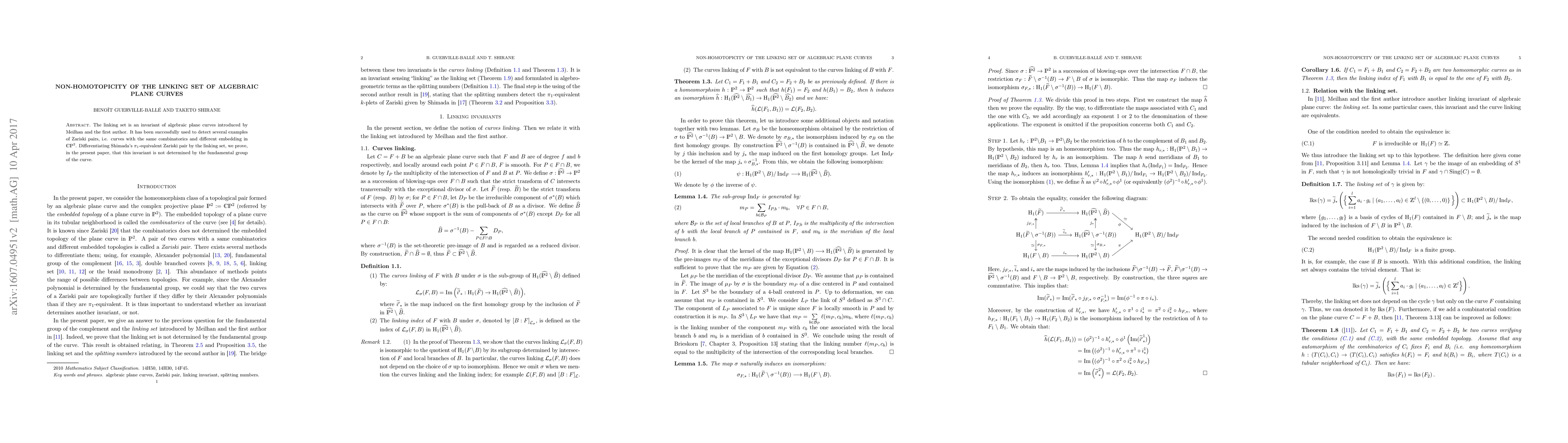 The linking set is an invariant of algebraic plane curves introduced by Meilhan and the first author. It has been successfully used to detect several examples of Zariski pairs, i.e. curves with the same combinatorics and different embedding in $\mathds{CP}^2$. Differentiating Shimada's $\pi_1$-equivalent Zariski pair by the linking set, we prove, in the present paper, that this invariant is not determined by the fundamental group of the curve.