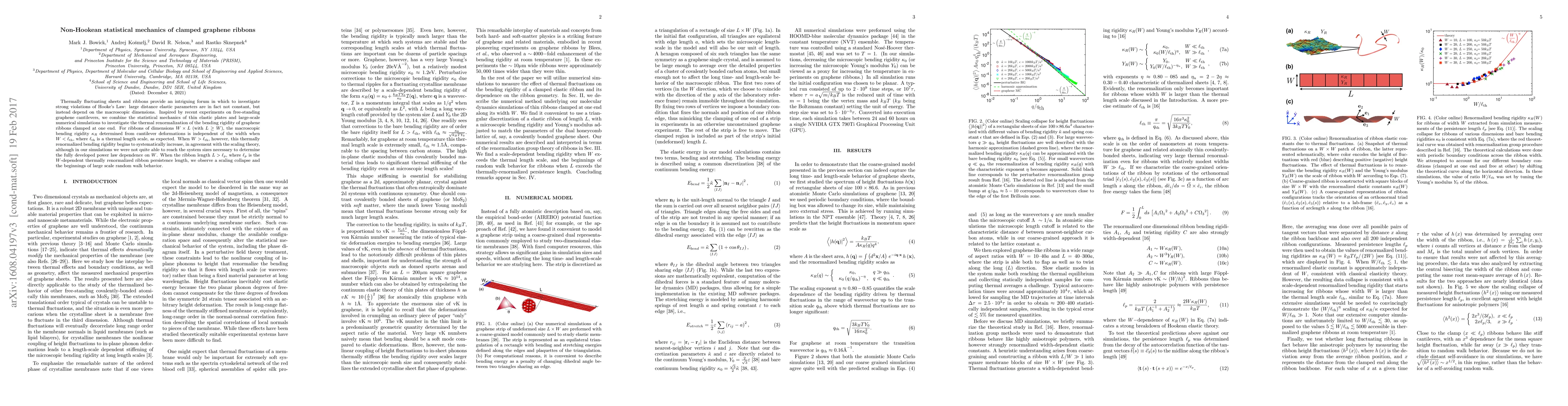 This paper investigates the non-Hookean behavior of thermally fluctuating graphene ribbons clamped at one end, revealing that the bending rigidity depends on the ribbon's macroscopic dimensions and thermal length scale. The study finds that the bending rigidity increases when the ribbon width exceeds a thermal length scale, showing early signs of large-scale random walk behavior when the length exceeds a thermally renormalized persistence length.