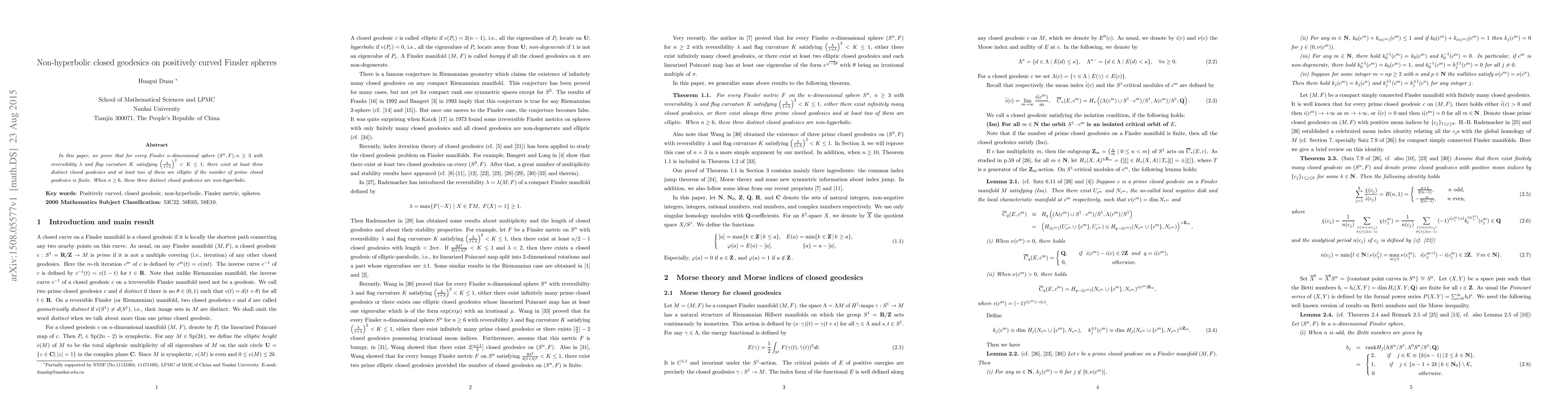 This paper demonstrates that for $n$-dimensional Finsler spheres ($n\ge 3$) with specific curvature conditions, there exist at least three distinct closed geodesics, with at least two being elliptic if prime closed geodesics are finite. For $n\ge 6$, these three geodesics are non-hyperbolic.
