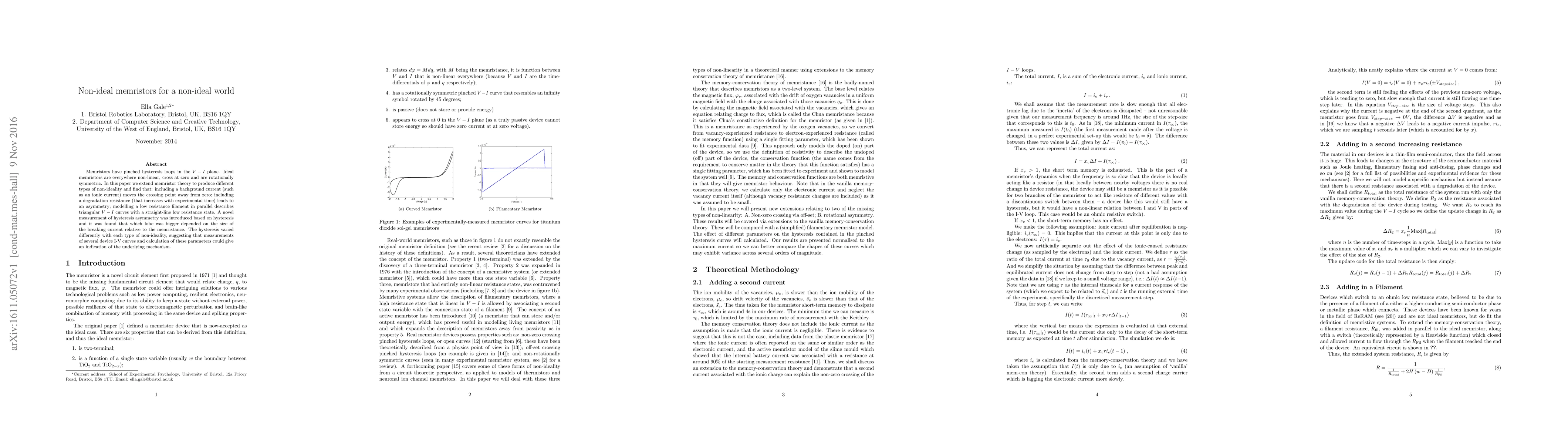 This paper extends memristor theory to account for various types of non-ideality, including background current, degradation resistance, and low resistance filaments. The study introduces a novel method to measure hysteresis asymmetry and finds that different non-idealities cause distinct variations in the $V-I$ curves, suggesting that analyzing these variations can reveal underlying mechanisms.