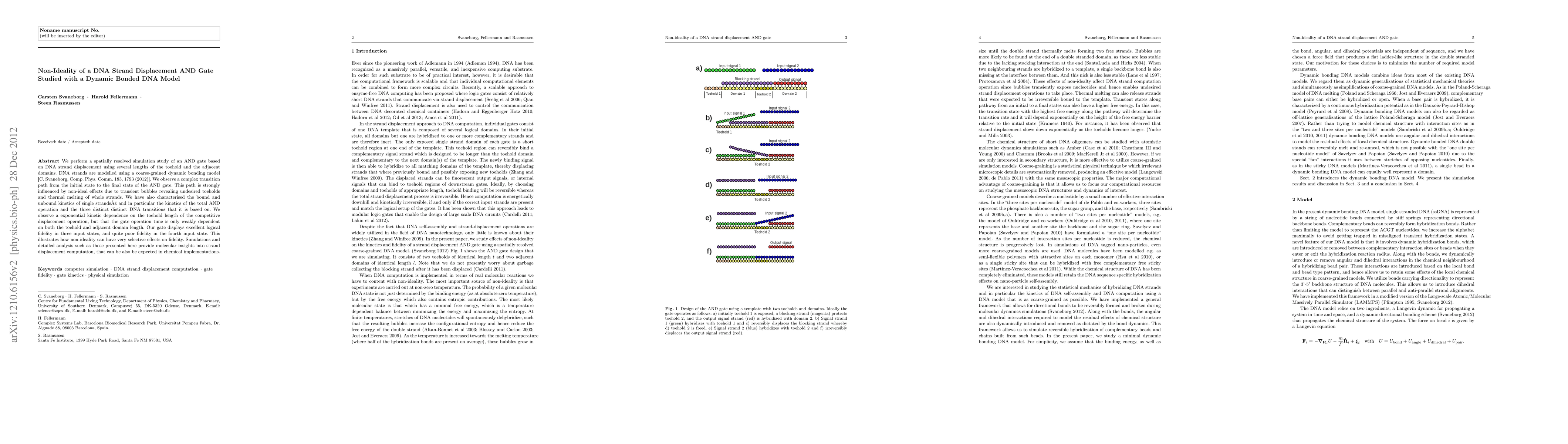 This study uses a dynamic bonded DNA model to simulate a DNA strand displacement-based AND gate, revealing complex transition paths influenced by non-ideal effects like transient bubbles and thermal melting. The research highlights selective fidelity impacts of non-ideality, showing strong dependence on toehold length for competitive displacement but weak dependence for gate operation time.