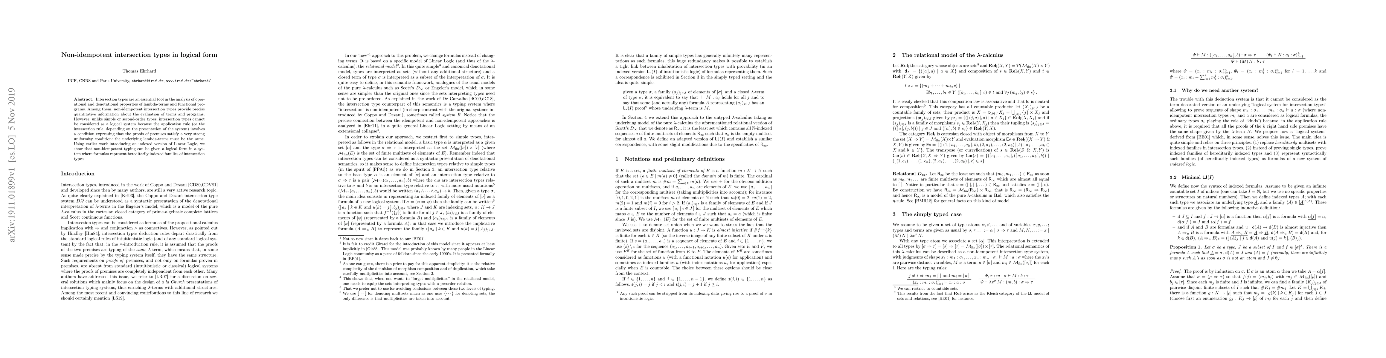 Intersection types are an essential tool in the analysis of operational and denotational properties of lambda-terms and functional programs. Among them, non-idempotent intersection types provide precise quantitative information about the evaluation of terms and programs. However, unlike simple or second-order types, intersection types cannot be considered as a logical system because the application rule (or the intersection rule, depending on the presentation of the system) involves a condition expressing that the proofs of premises satisfy a very strong uniformity condition: the underlying lambda-terms must be the same. Using earlier work introducing an indexed version of Linear Logic, we show that non-idempotent typing can be given a logical form in a system where formulas represent hereditarily indexed families of intersection types.