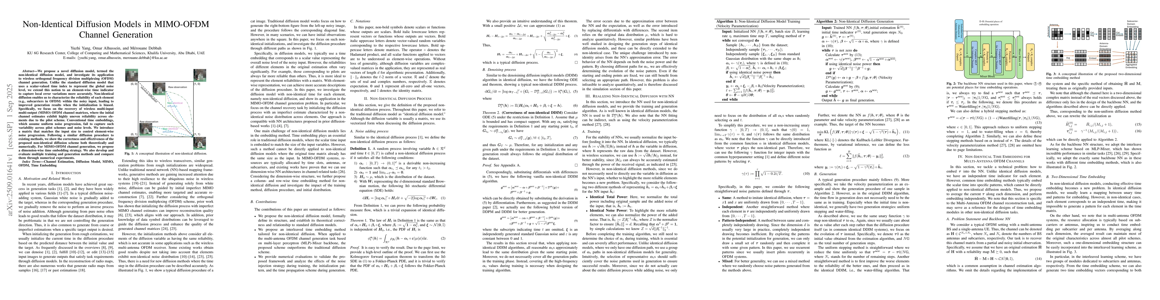 We propose a novel diffusion model, termed the non-identical diffusion model, and investigate its application to wireless orthogonal frequency division multiplexing (OFDM) channel generation. Unlike the standard diffusion model that uses a scalar-valued time index to represent the global noise level, we extend this notion to an element-wise time indicator to capture local error variations more accurately. Non-identical diffusion enables us to characterize the reliability of each element (e.g., subcarriers in OFDM) within the noisy input, leading to improved generation results when the initialization is biased. Specifically, we focus on the recovery of wireless multi-input multi-output (MIMO) OFDM channel matrices, where the initial channel estimates exhibit highly uneven reliability across elements due to the pilot scheme. Conventional time embeddings, which assume uniform noise progression, fail to capture such variability across pilot schemes and noise levels. We introduce a matrix that matches the input size to control element-wise noise progression. Following a similar diffusion procedure to existing methods, we show the correctness and effectiveness of the proposed non-identical diffusion scheme both theoretically and numerically. For MIMO-OFDM channel generation, we propose a dimension-wise time embedding strategy. We also develop and evaluate multiple training and generation methods and compare them through numerical experiments.