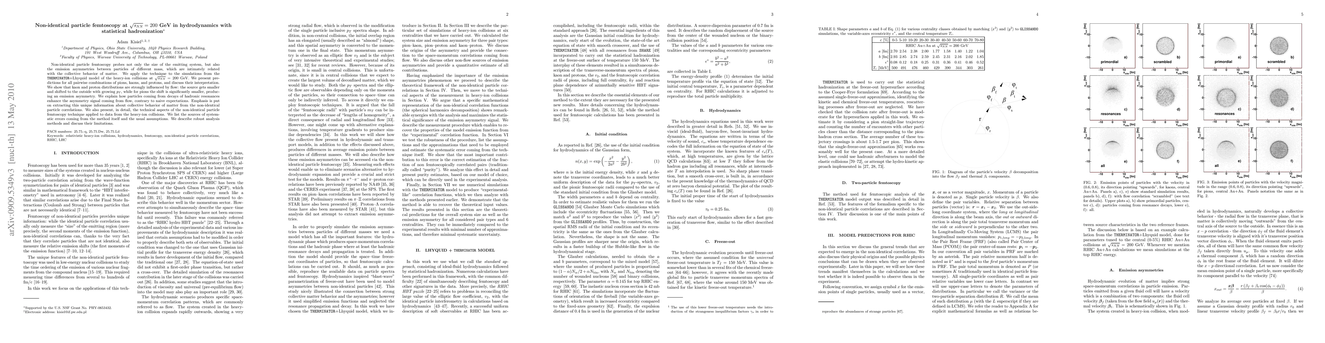 This paper uses the THERMINATOR+Lhyquid model to simulate heavy-ion collisions at sqrt{s_NN}=200 AGeV, applying non-identical particle femtoscopy to study emission asymmetries and collective behavior of matter. It presents predictions for all pair combinations, discusses their interpretation, and details the technique's technical aspects, systematic errors, and analysis methods.
