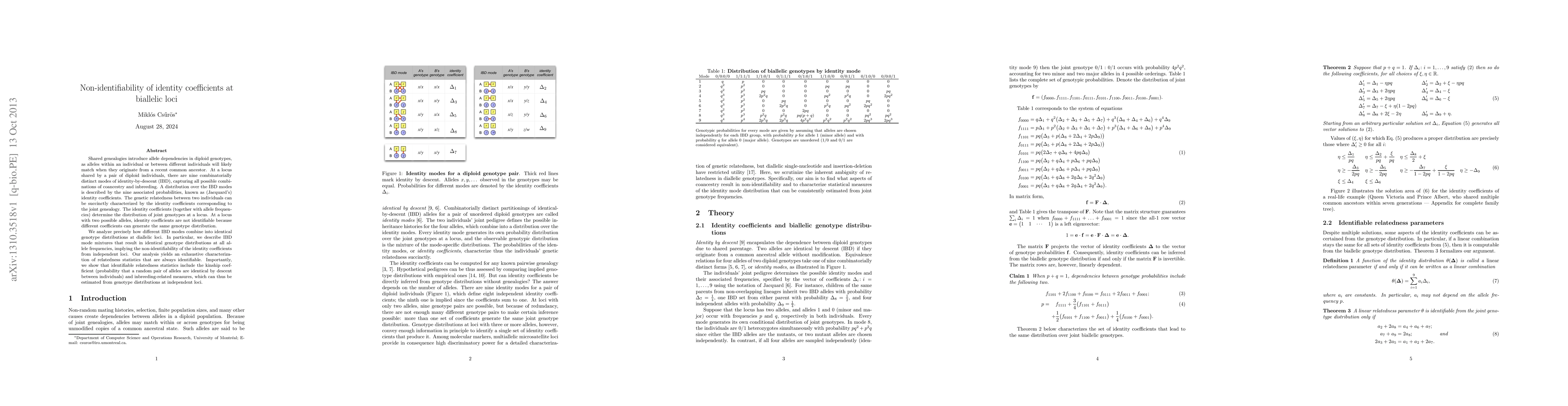 This paper explores the non-identifiability of identity coefficients at biallelic loci due to allele dependencies introduced by shared genealogies. It demonstrates that different combinations of identity-by-descent modes can produce identical genotype distributions, thus rendering identity coefficients unidentifiable. However, it identifies kinship coefficients and inbreeding measures as always identifiable relatedness statistics.