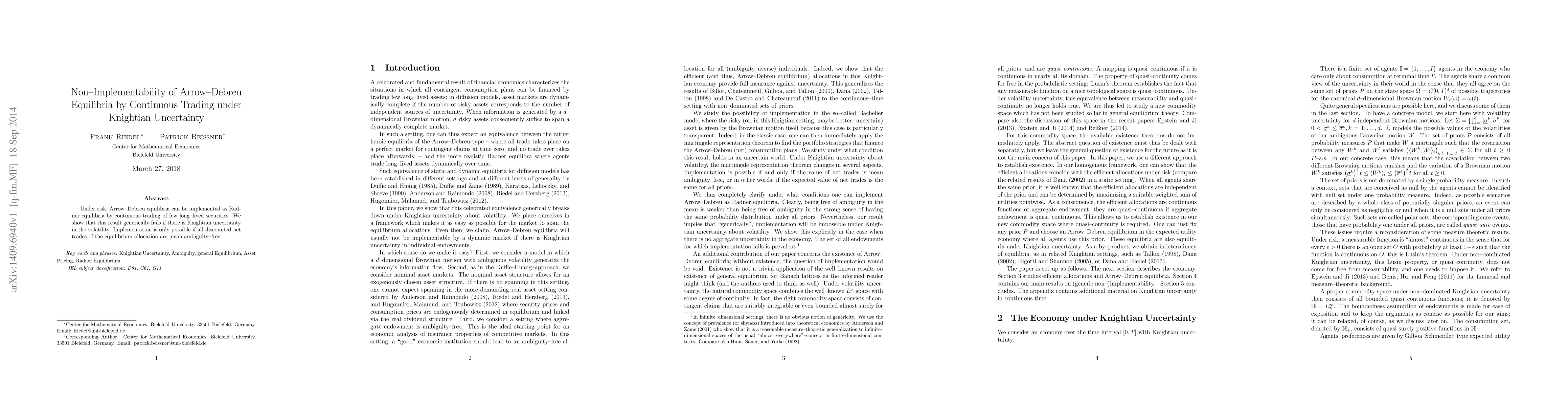 Summary: This paper demonstrates that Arrow-Debreu equilibria cannot be implemented through continuous trading under Knightian uncertainty, where volatility is inherently ambiguous. Implementation is feasible only if the equilibrium allocation's discounted net trades are mean ambiguity-free.