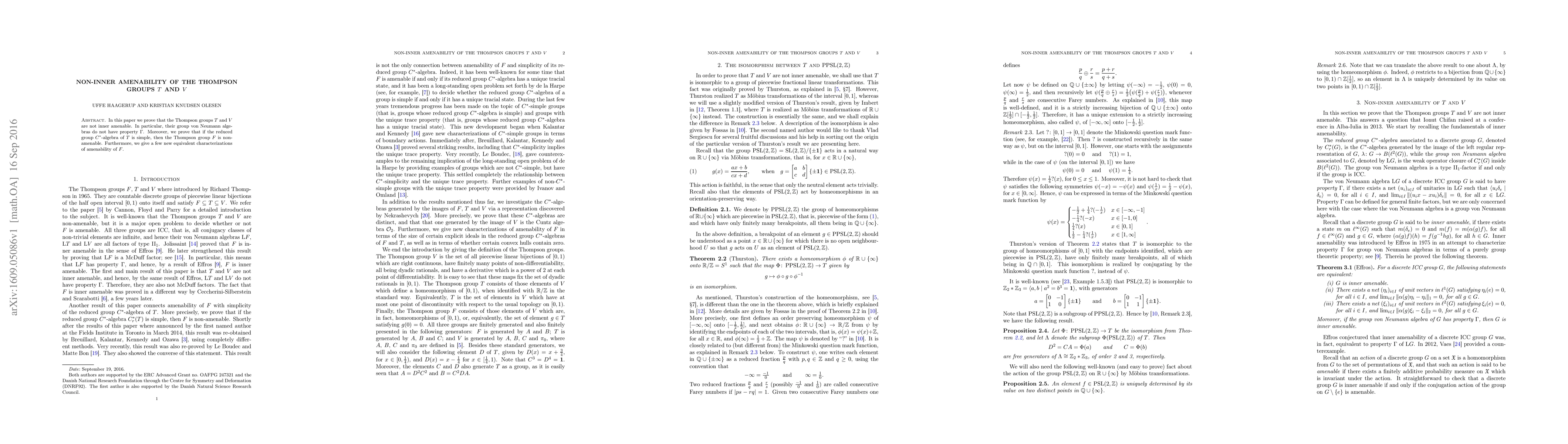 In this paper we prove that the Thompson groups $T$ and $V$ are not inner amenable. In particular, their group von Neumann algebras do not have property $\Gamma$. Moreover, we prove that if the reduced group $C^\ast$-algebra of $T$ is simple, then the Thompson group $F$ is non-amenable. Furthermore, we give a few new equivalent characterizations of amenability of $F$.
