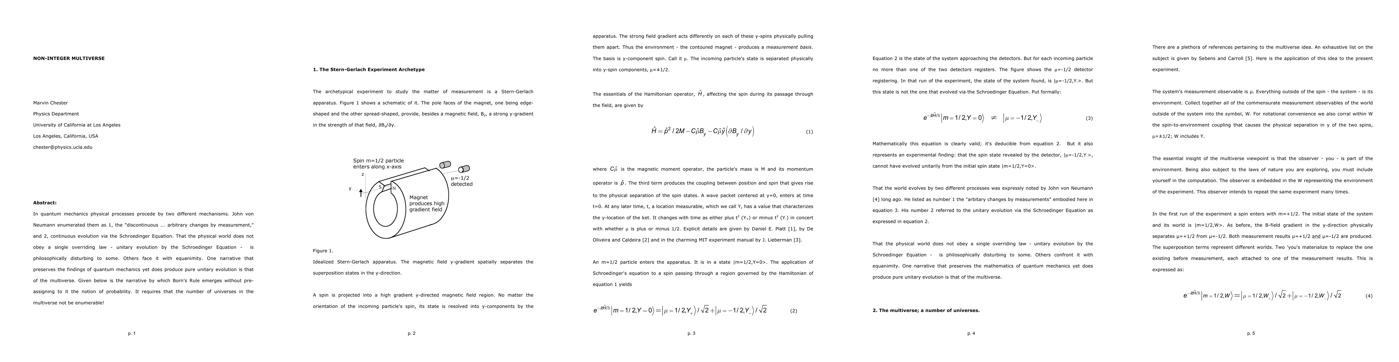 In quantum mechanics physical processes procede by two different mechanisms. John von Neumann enumerated them as 1, the "discontinuous ... arbitrary changes by measurement," and 2, continuous evolution via the Schroedinger Equation. That the physical world does not obey a single overriding law - unitary evolution by the Schroedinger Equation - is philosophically disturbing to some. Others face it with equanimity. One narrative that preserves the findings of quantum mechanics yet does produce pure unitary evolution is that of the multiverse. Given below is the narrative by which Born's Rule emerges without pre-assigning to it the notion of probability. It requires that the number of universes in the multiverse not be enumerable!
