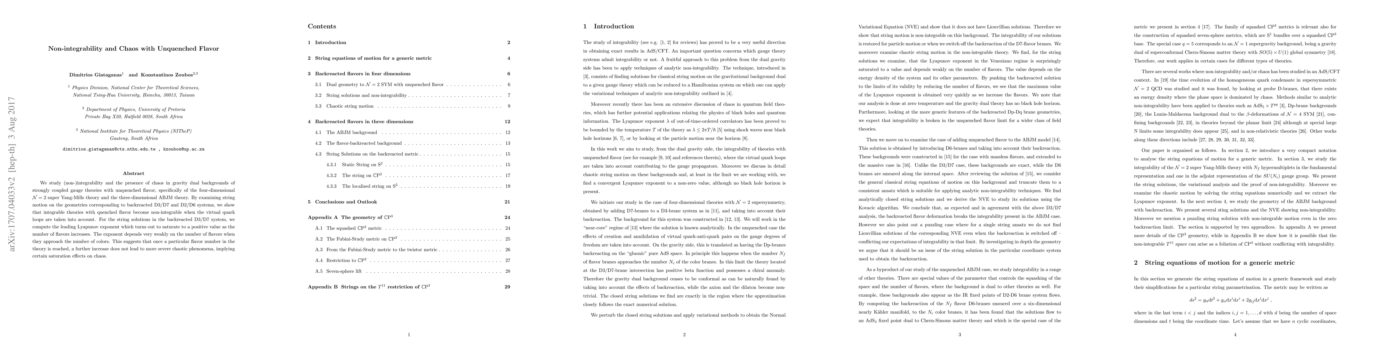 This research investigates how non-integrability and chaos emerge in gravity duals of strongly coupled gauge theories with unquenched flavor, focusing on four-dimensional N=2 super Yang-Mills and three-dimensional ABJM theories. The study reveals that including virtual quark loops transforms previously integrable theories with quenched flavor into non-integrable ones, evidenced by a positive leading Lyapunov exponent in the D3/D7 system, which saturates as the number of flavors approaches the number of colors.