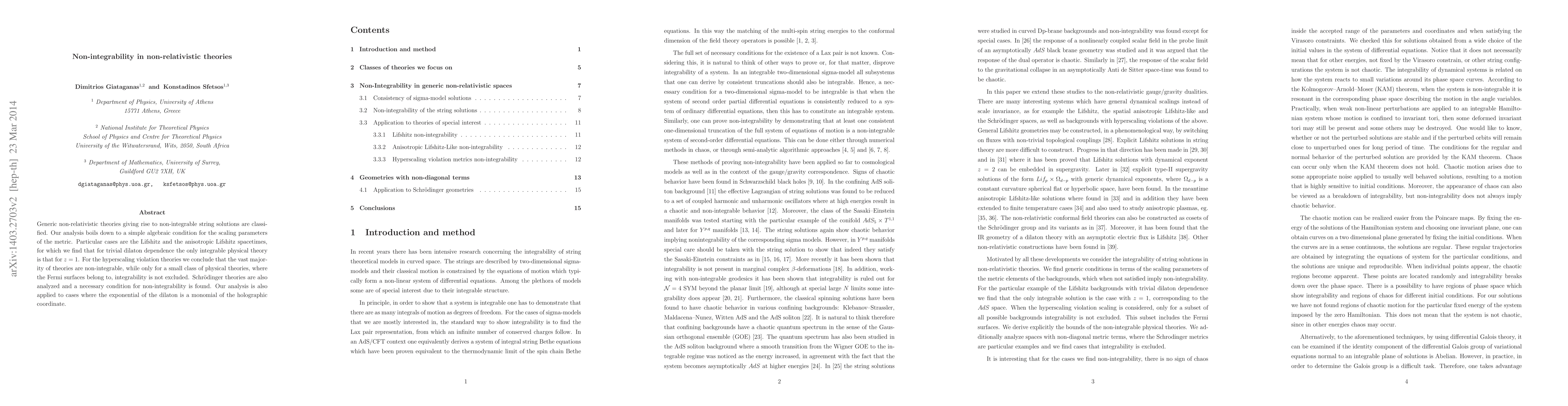 This paper classifies non-integrable non-relativistic theories, identifying a simple algebraic condition for metric scaling parameters. It finds that only Lifshitz theories with z=1 are integrable under trivial dilaton dependence, while most hyperscaling violation theories are non-integrable, except for those involving Fermi surfaces.