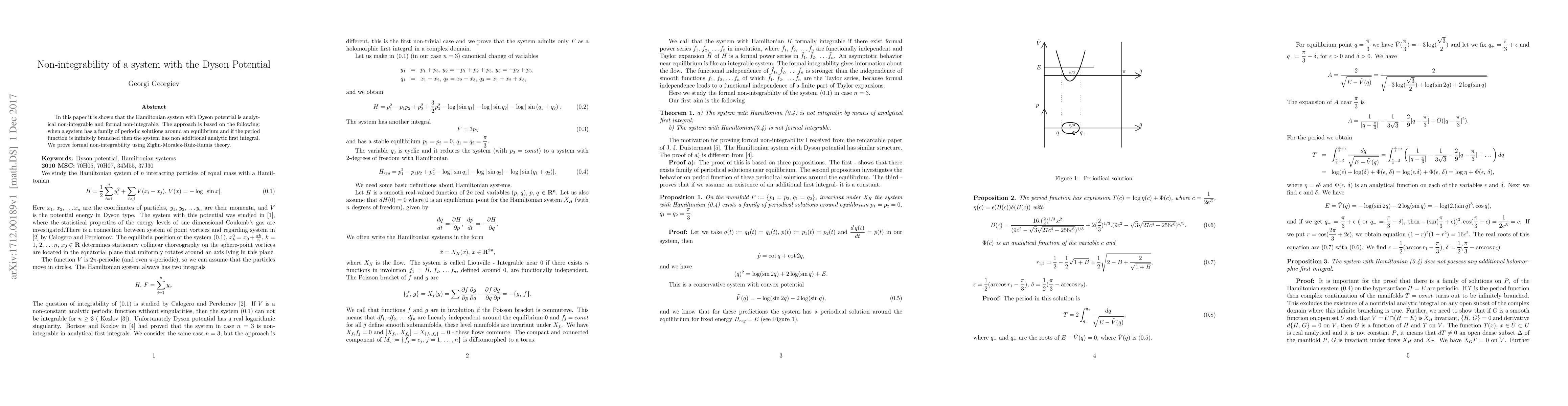 This paper demonstrates that the Hamiltonian system with the Dyson potential is both analytically and formally non-integrable. The authors prove this by showing that the system lacks additional analytic first integrals when it has infinitely branched periodic solutions around an equilibrium, and utilize Ziglin-Moralez-Ruiz-Ramis theory for formal non-integrability.