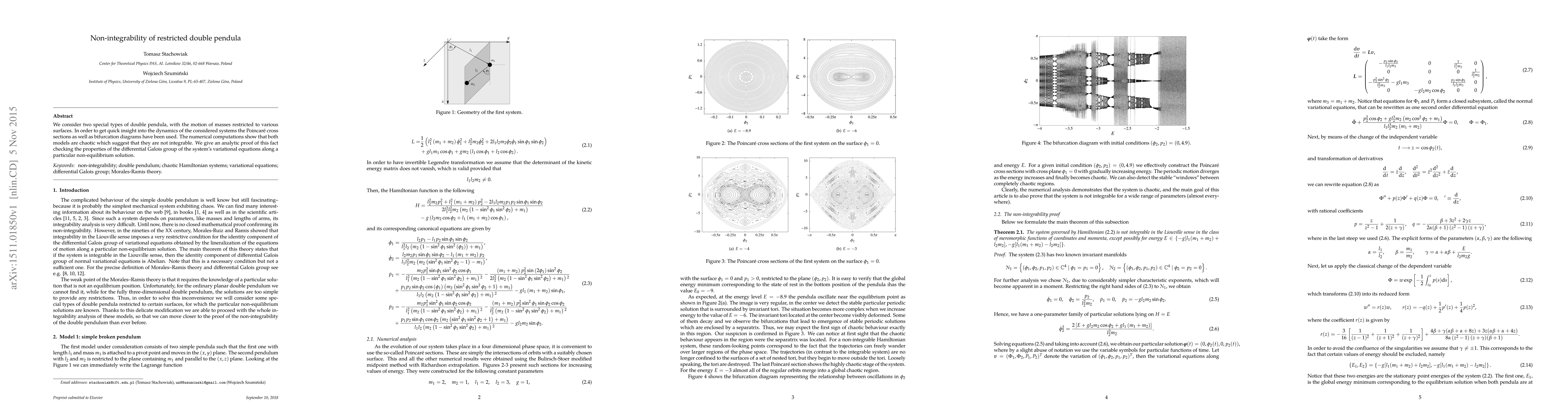 This paper investigates the dynamics of two restricted double pendula, revealing chaotic behavior through Poincaré sections and bifurcation diagrams. An analytic proof confirms their non-integrability by examining the differential Galois group of the system's variational equations.