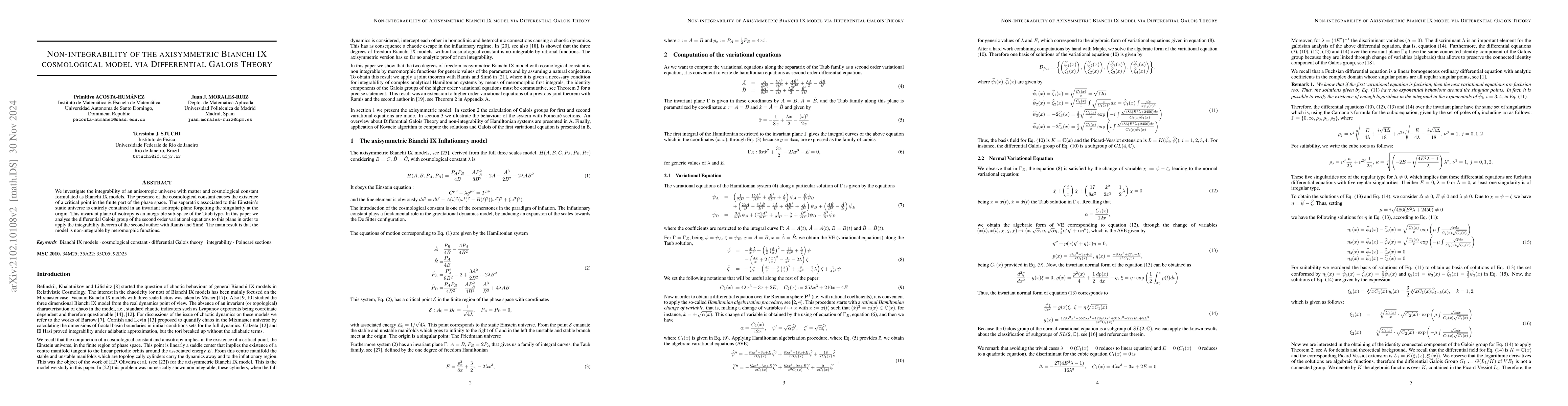 This paper examines the integrability of the anisotropic Bianchi IX cosmological model, revealing that the presence of a cosmological constant leads to a critical point in phase space. Despite an invariant isotropic plane that is integrable, the model is ultimately shown to be non-integrable via Differential Galois Theory.