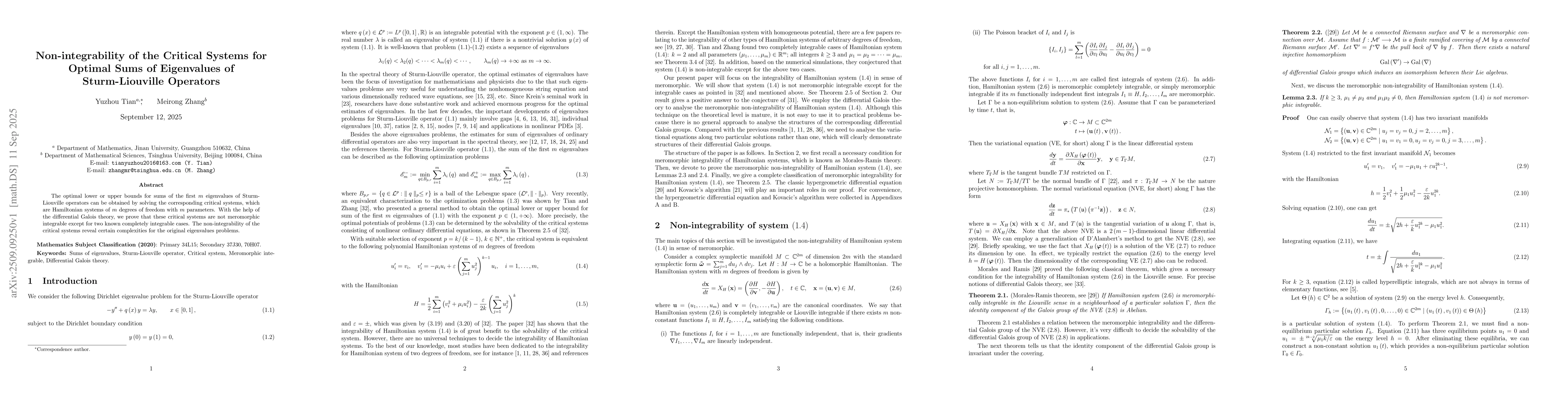 The optimal lower or upper bounds for sums of the first $m$ eigenvalues of Sturm-Liouville operators can be obtained by solving the corresponding critical systems, which are Hamiltonian systems of $m$ degrees of freedom with $m$ parameters. With the help of the differential Galois theory, we prove that these critical systems are not meromorphic integrable except for two known completely integrable cases. The non-integrability of the critical systems reveal certain complexities for the original eigenvalues problems.