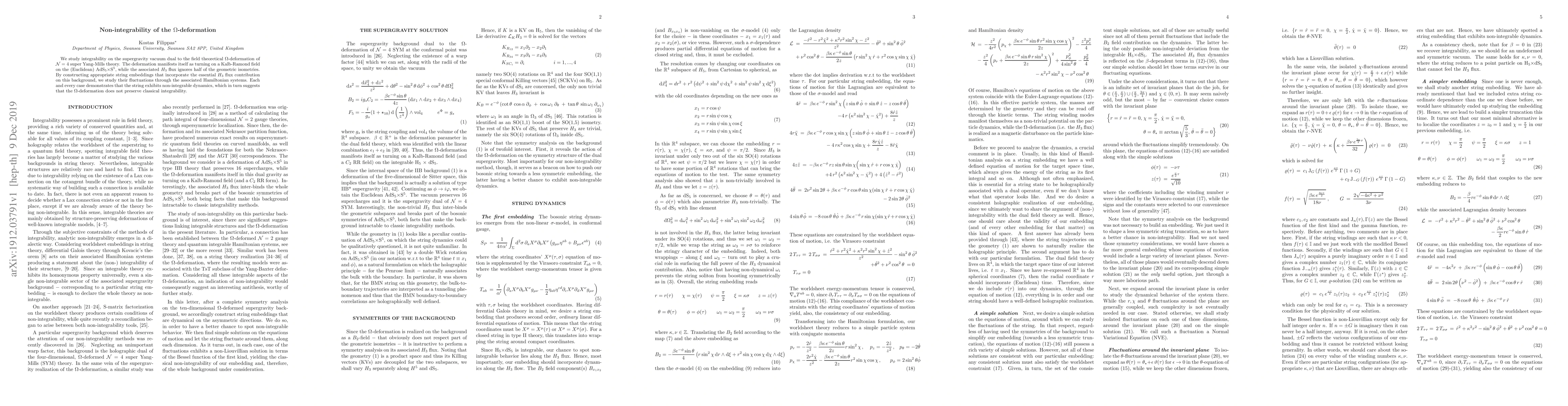 This paper investigates the integrability of the supergravity dual to the $\Omega$-deformation in $\mathcal{N}=4$ super Yang-Mills theory, finding that string embeddings incorporating $H_3$ flux lead to non-integrable dynamics, indicating the deformation does not preserve classical integrability.
