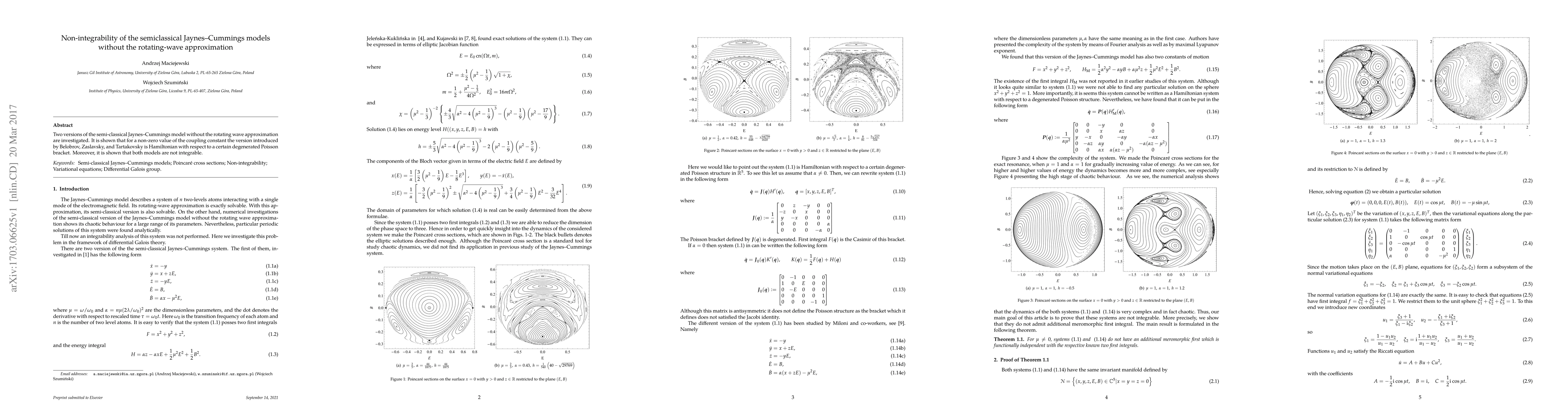 Summary: This paper investigates two versions of the semiclassical Jaynes-Cummings model without the rotating-wave approximation, revealing that one version is Hamiltonian but neither model is integrable.