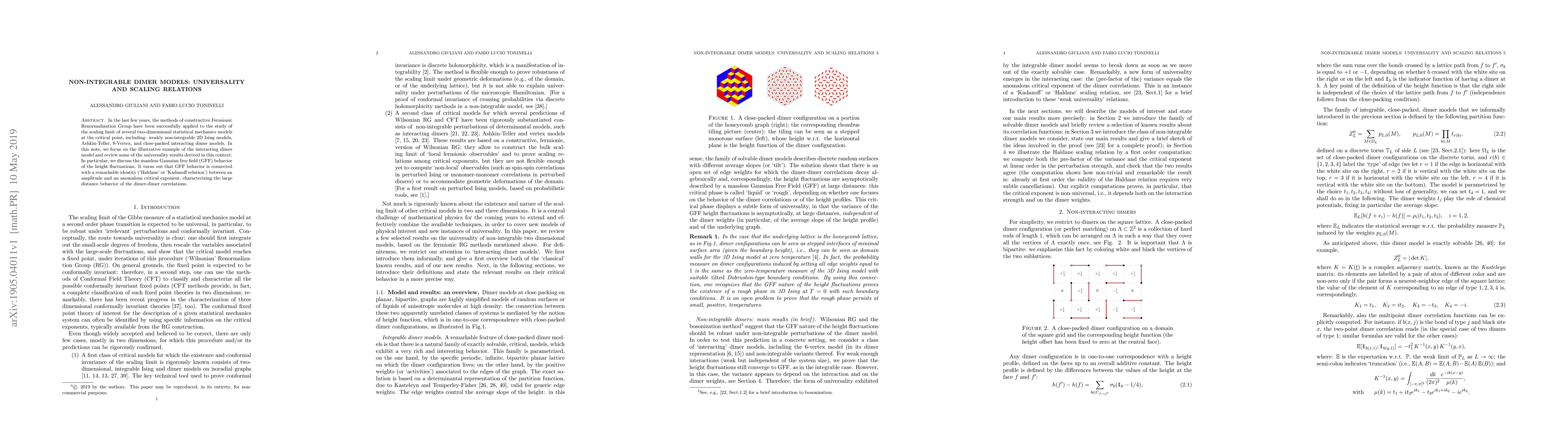 In the last few years, the methods of constructive Fermionic Renormalization Group have been successfully applied to the study of the scaling limit of several two-dimensional statistical mechanics models at the critical point, including: weakly non-integrable 2D Ising models, Ashkin-Teller, 8-Vertex, and close-packed interacting dimer models. In this note, we will focus on the illustrative example of the interacting dimer model and review some of the universality results derived in this context. In particular, we will discuss the massless Gaussian free field (GFF) behavior of the height fluctuations. It turns out that GFF behavior is connected with a remarkable identity (`Haldane' or 'Kadanoff relation') between an amplitude and an anomalous critical exponent, characterizing the large distance behavior of the dimer-dimer correlations.