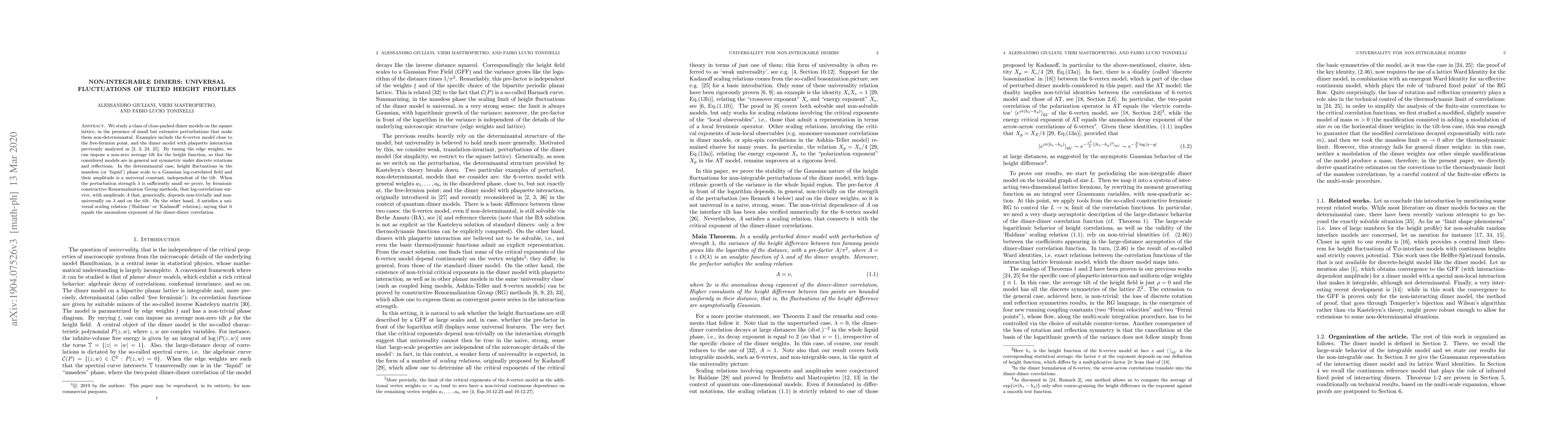 This paper investigates non-integrable dimer models on the square lattice, showing that despite small perturbations, log-correlated fluctuations in height profiles persist, though their amplitude depends non-trivially on the perturbation strength and tilt. The amplitude follows a universal scaling relation tied to the anomalous exponent of dimer-dimer correlations.