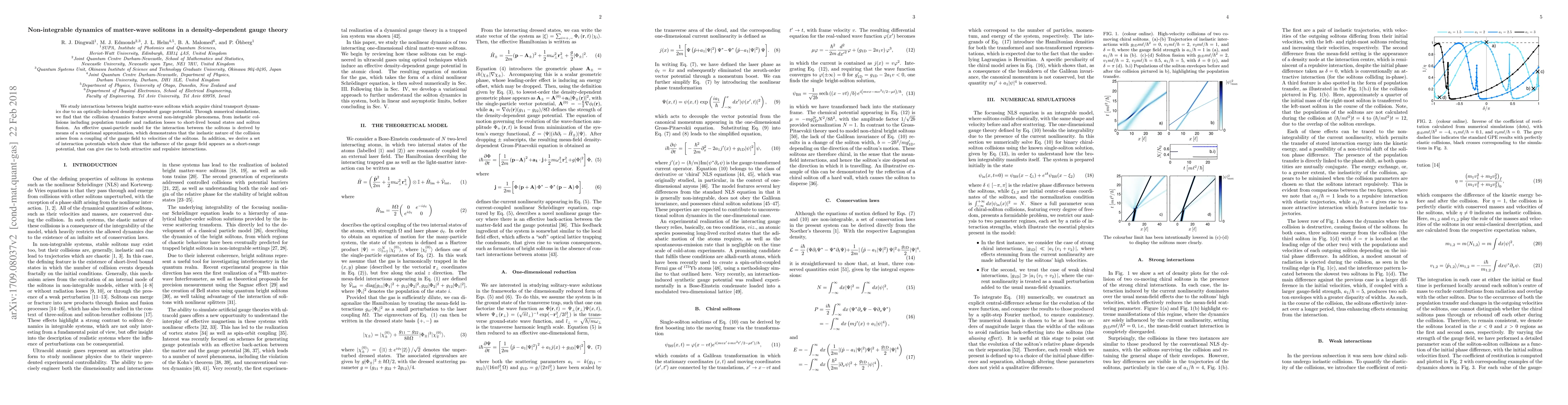 This paper investigates the complex dynamics of bright matter-wave solitons influenced by an optically-induced density-dependent gauge potential, revealing non-integrable phenomena such as inelastic collisions, population transfer, and soliton fission through numerical simulations. An effective quasi-particle model elucidates the inelastic collision nature due to gauge field coupling with soliton velocities, and interaction potentials demonstrate both attractive and repulsive forces.
