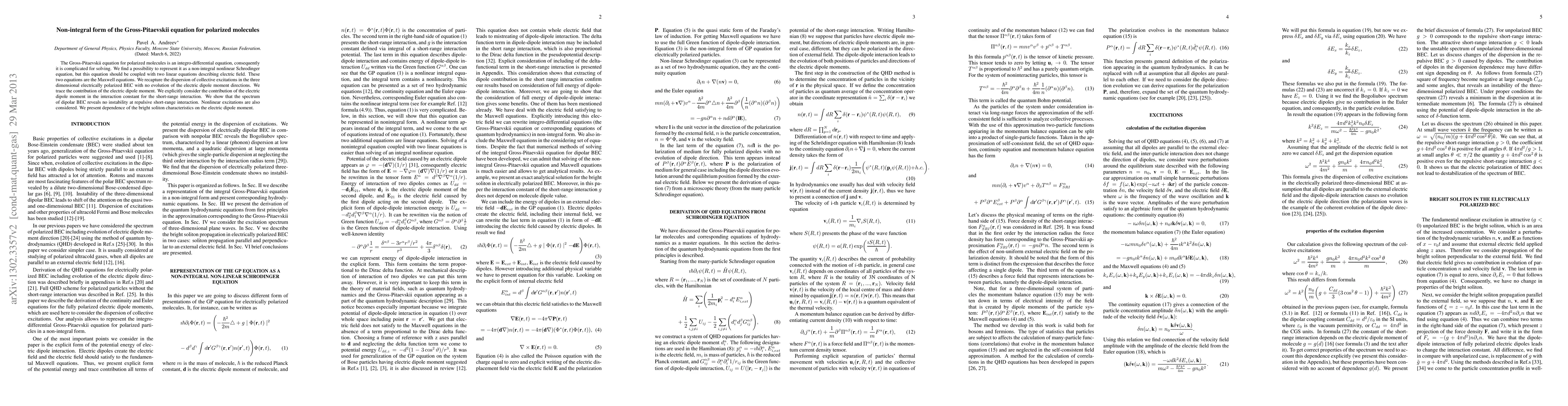 The Gross-Pitaevskii equation for polarized molecules is an integro-differential equation, consequently it is complicated for solving. We find a possibility to represent it as a non-integral nonlinear Schrodinger equation, but this equation should be coupled with two linear equations describing electric field. These two equations are the Maxwell equations. We recapture the dispersion of collective excitations in the three dimensional electrically polarized BEC with no evolution of the electric dipole moment directions. We trace the contribution of the electric dipole moment. We explicitly consider the contribution of the electric dipole moment in the interaction constant for the short-range interaction. We show that the spectrum of dipolar BEC reveals no instability at repulsive short-range interaction. Nonlinear excitations are also considered. We present dependence of the bright soliton characteristics on the electric dipole moment.