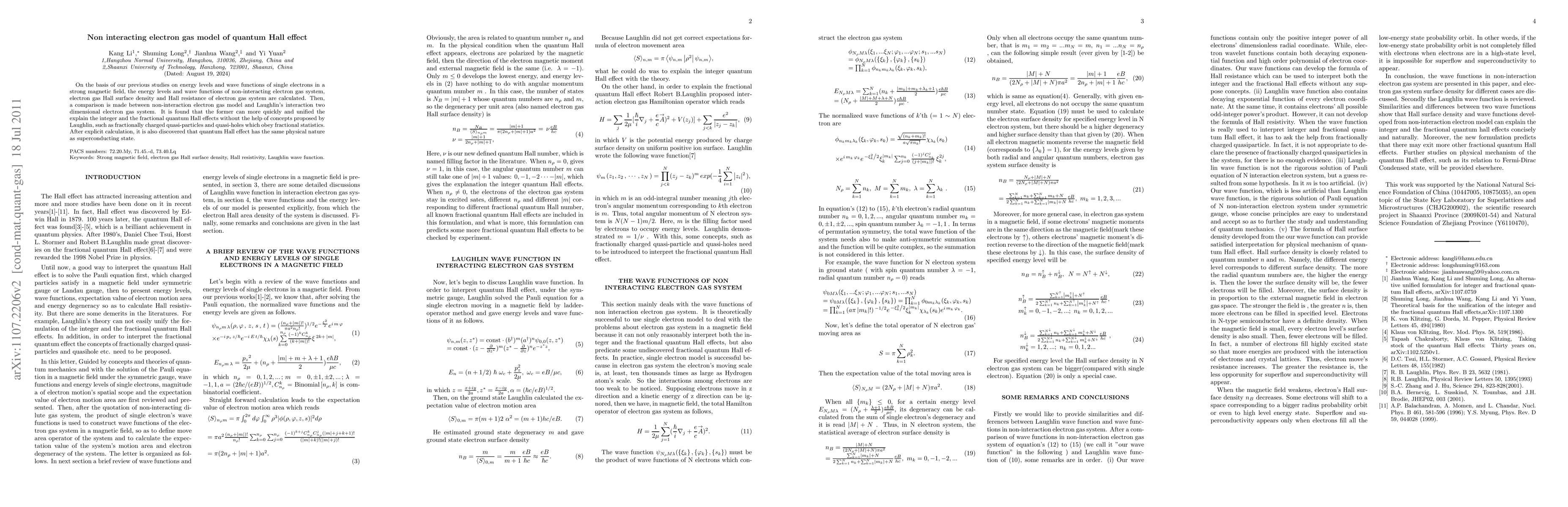 On the basis of our previous studies on energy levels and wave functions of single electrons in a strong magnetic field, the energy levels and wave functions of non-interacting electron gas system, electron gas Hall surface density and Hall resistance of electron gas system are calculated. Then, a comparison is made between non-interaction electron gas model and Laughlin's interaction two dimensional electron gas system. It is found that the former can more quickly and unified the explain the integer and the fractional quantum Hall effects without the help of concepts proposed by Laughlin, such as fractionally charged quasi-particles and quasi-holes which obey fractional statistics. After explicit calculation, it is also discovered that quantum Hall effect has the same physical nature as superconducting state.
