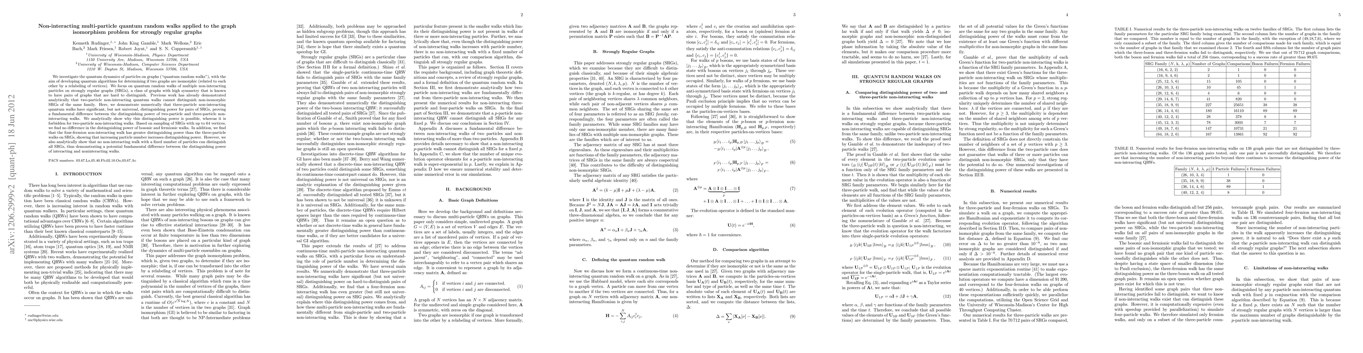 This paper explores quantum random walks of multiple non-interacting particles on strongly regular graphs to determine graph isomorphism. It finds that while two-particle walks cannot distinguish non-isomorphic SRGs, three-particle walks show significant distinguishing power, and four-fermion walks outperform three-particle walks, though no fixed number of particles can universally distinguish all SRGs.