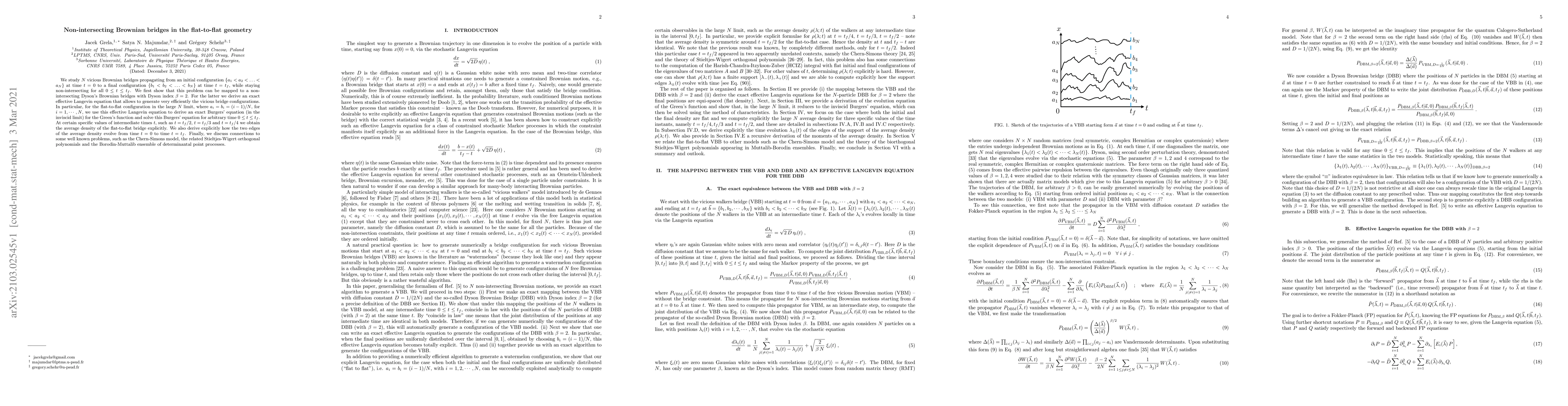 Researchers study non-intersecting Brownian bridges that move from an initial to a final configuration without intersecting, mapping the problem to Dyson's Brownian bridges and deriving an exact effective Langevin equation to generate bridge configurations. This leads to exact solutions for the average density of flat-to-flat bridges at specific times and insights into connections with other mathematical models.
