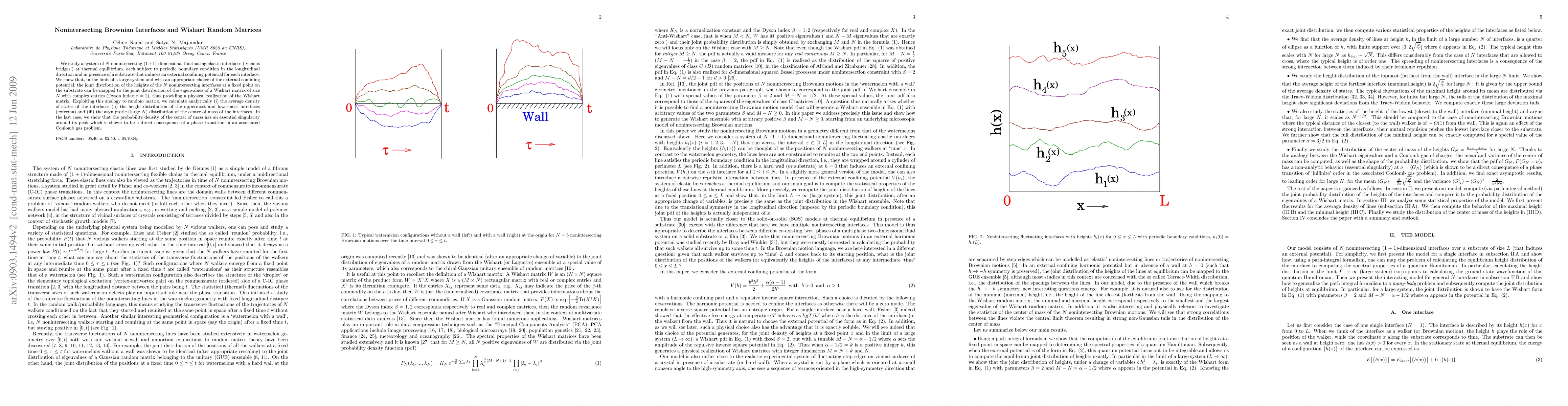 Researchers study non-intersecting Brownian interfaces at thermal equilibrium, mapping their height distribution to that of a Wishart random matrix, which helps calculate key properties like the average density of states and the asymptotic distribution of the center of mass.