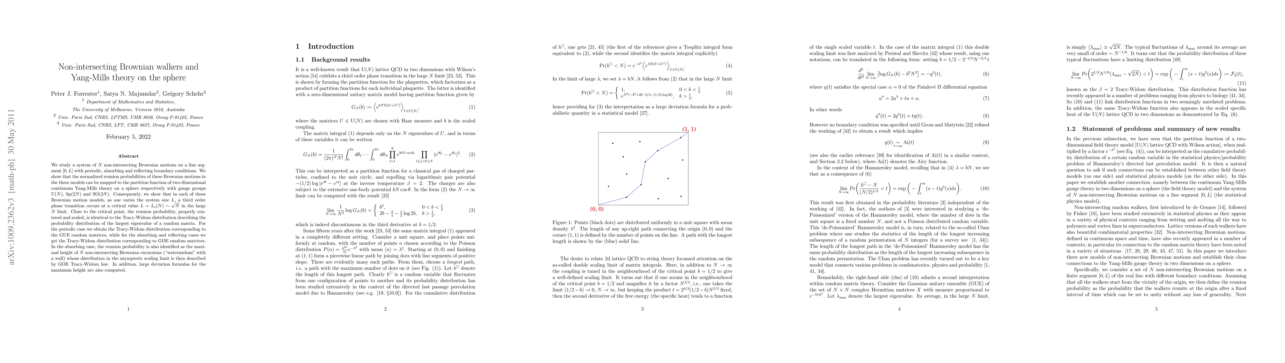 We study a system of N non-intersecting Brownian motions on a line segment [0,L] with periodic, absorbing and reflecting boundary conditions. We show that the normalized reunion probabilities of these Brownian motions in the three models can be mapped to the partition function of two-dimensional continuum Yang-Mills theory on a sphere respectively with gauge groups U(N), Sp(2N) and SO(2N). Consequently, we show that in each of these Brownian motion models, as one varies the system size L, a third order phase transition occurs at a critical value L=L_c(N)\sim \sqrt{N} in the large N limit. Close to the critical point, the reunion probability, properly centered and scaled, is identical to the Tracy-Widom distribution describing the probability distribution of the largest eigenvalue of a random matrix. For the periodic case we obtain the Tracy-Widom distribution corresponding to the GUE random matrices, while for the absorbing and reflecting cases we get the Tracy-Widom distribution corresponding to GOE random matrices. In the absorbing case, the reunion probability is also identified as the maximal height of N non-intersecting Brownian excursions ("watermelons" with a wall) whose distribution in the asymptotic scaling limit is then described by GOE Tracy-Widom law. In addition, large deviation formulas for the maximum height are also computed.
