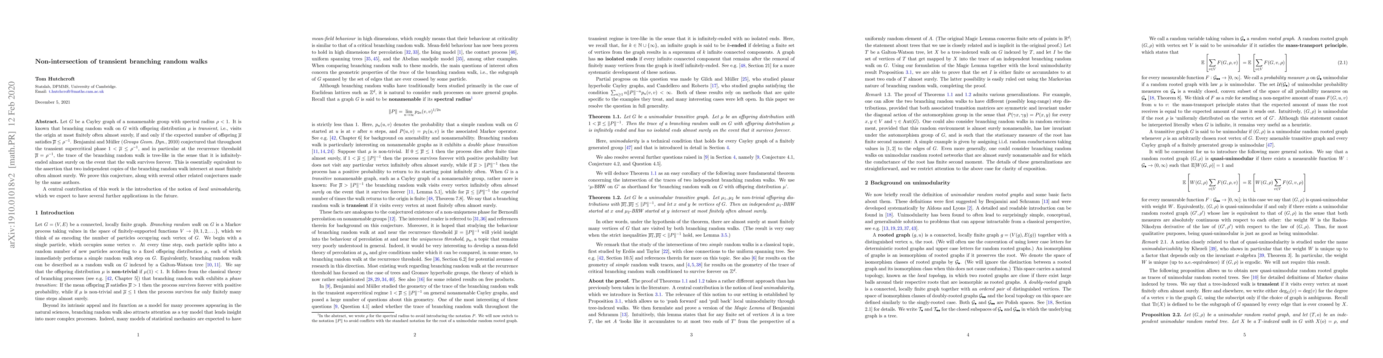Let $G$ be a Cayley graph of a nonamenable group with spectral radius $\rho < 1$. It is known that branching random walk on $G$ with offspring distribution $\mu$ is transient, i.e., visits the origin at most finitely often almost surely, if and only if the expected number of offspring $\bar \mu$ satisfies $\bar \mu \leq \rho^{-1}$. Benjamini and M\"uller (2010) conjectured that throughout the transient supercritical phase $1<\bar{\mu} \leq \rho^{-1}$, and in particular at the recurrence threshold $\bar \mu = \rho^{-1}$, the trace of the branching random walk is tree-like in the sense that it is infinitely-ended almost surely on the event that the walk survives forever. This is essentially equivalent to the assertion that two independent copies of the branching random walk intersect at most finitely often almost surely. We prove this conjecture, along with several other related conjectures made by the same authors. A central contribution of this work is the introduction of the notion of local unimodularity, which we expect to have several further applications in the future.