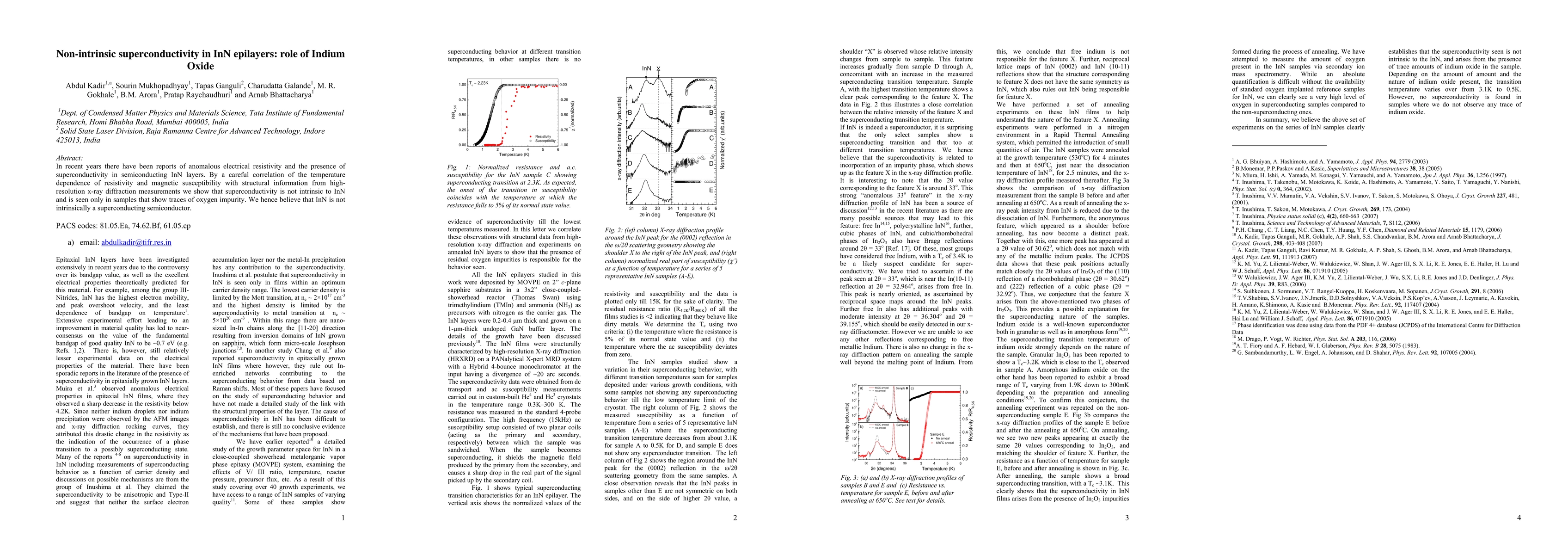 In recent years there have been reports of anomalous electrical resistivity and the presence of superconductivity in semiconducting InN layers. By a careful correlation of the temperature dependence of resistivity and magnetic susceptibility with structural information from highresolution x-ray diffraction measurements we show that superconductivity is not intrinsic to InN and is seen only in samples that show traces of oxygen impurity. We hence believe that InN is not intrinsically a superconducting semiconductor.