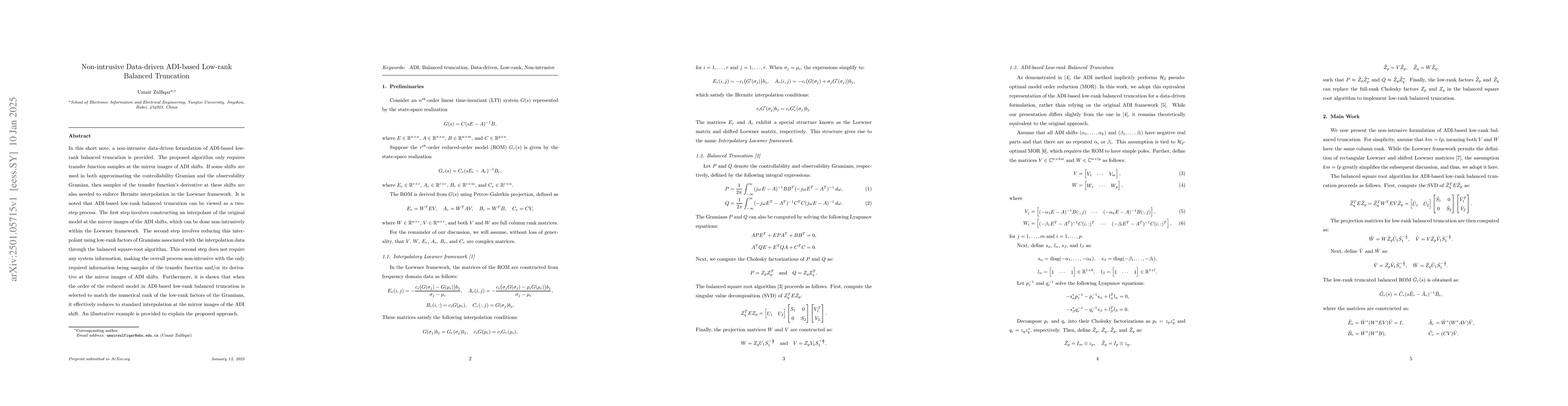 In this short note, a non-intrusive data-driven formulation of ADI-based low-rank balanced truncation is provided. The proposed algorithm only requires transfer function samples at the mirror images of ADI shifts. If some shifts are used in both approximating the controllability Gramian and the observability Gramian, then samples of the transfer function's derivative at these shifts are also needed to enforce Hermite interpolation in the Loewner framework. It is noted that ADI-based low-rank balanced truncation can be viewed as a two-step process. The first step involves constructing an interpolant of the original model at the mirror images of the ADI shifts, which can be done non-intrusively within the Loewner framework. The second step involves reducing this interpolant using low-rank factors of Gramians associated with the interpolation data through the balanced square-root algorithm. This second step does not require any system information, making the overall process non-intrusive with the only required information being samples of the transfer function and/or its derivative at the mirror images of ADI shifts. Furthermore, it is shown that when the order of the reduced model in ADI-based low-rank balanced truncation is selected to match the numerical rank of the low-rank factors of the Gramians, it effectively reduces to standard interpolation at the mirror images of the ADI shift. An illustrative example is provided to explain the proposed approach.