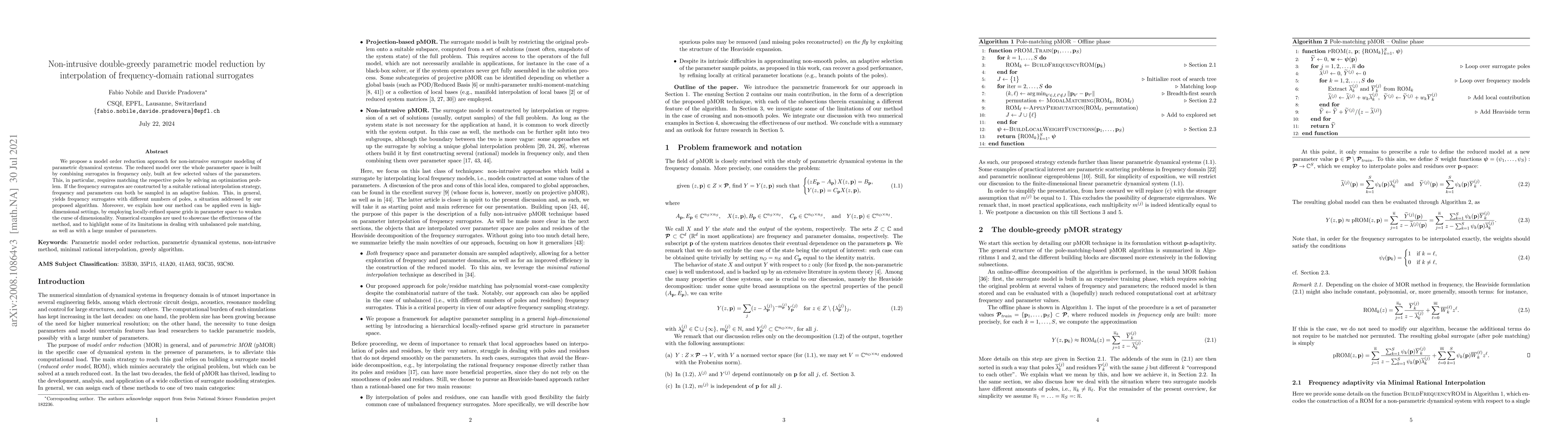 We propose a model order reduction approach for non-intrusive surrogate modeling of parametric dynamical systems. The reduced model over the whole parameter space is built by combining surrogates in frequency only, built at few selected values of the parameters. This, in particular, requires matching the respective poles by solving an optimization problem. If the frequency surrogates are constructed by a suitable rational interpolation strategy, frequency and parameters can both be sampled in an adaptive fashion. This, in general, yields frequency surrogates with different numbers of poles, a situation addressed by our proposed algorithm. Moreover, we explain how our method can be applied even in high-dimensional settings, by employing locally-refined sparse grids in parameter space to weaken the curse of dimensionality. Numerical examples are used to showcase the effectiveness of the method, and to highlight some of its limitations in dealing with unbalanced pole matching, as well as with a large number of parameters.