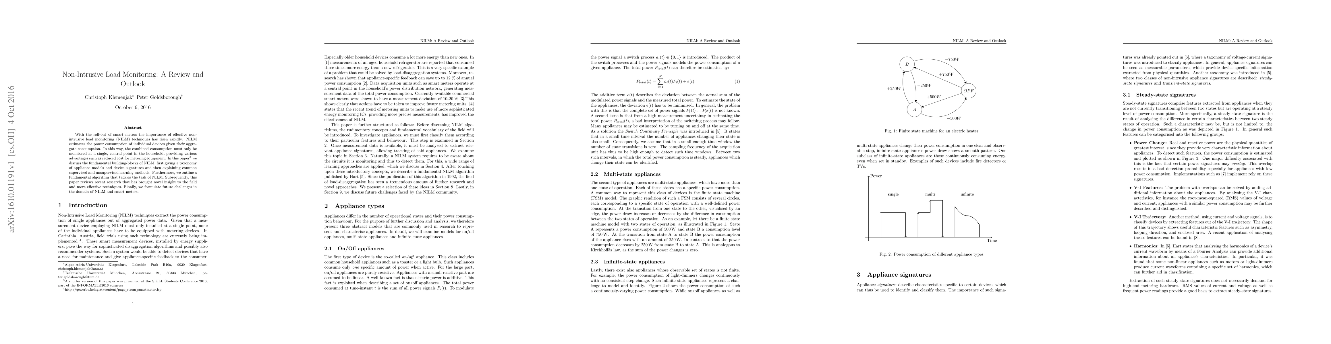 With the roll-out of smart meters the importance of effective non-intrusive load monitoring (NILM) techniques has risen rapidly. NILM estimates the power consumption of individual devices given their aggregate consumption. In this way, the combined consumption must only be monitored at a single, central point in the household, providing various advantages such as reduced cost for metering equipment. In this paper we discuss the fundamental building-blocks of NILM, first giving a taxonomy of appliance models and device signatures and then explaining common supervised and unsupervised learning methods. Furthermore, we outline a fundamental algorithm that tackles the task of NILM. Subsequently, this paper reviews recent research that has brought novel insight to the field and more effective techniques. Finally, we formulate future challenges in the domain of NILM and smart meters.