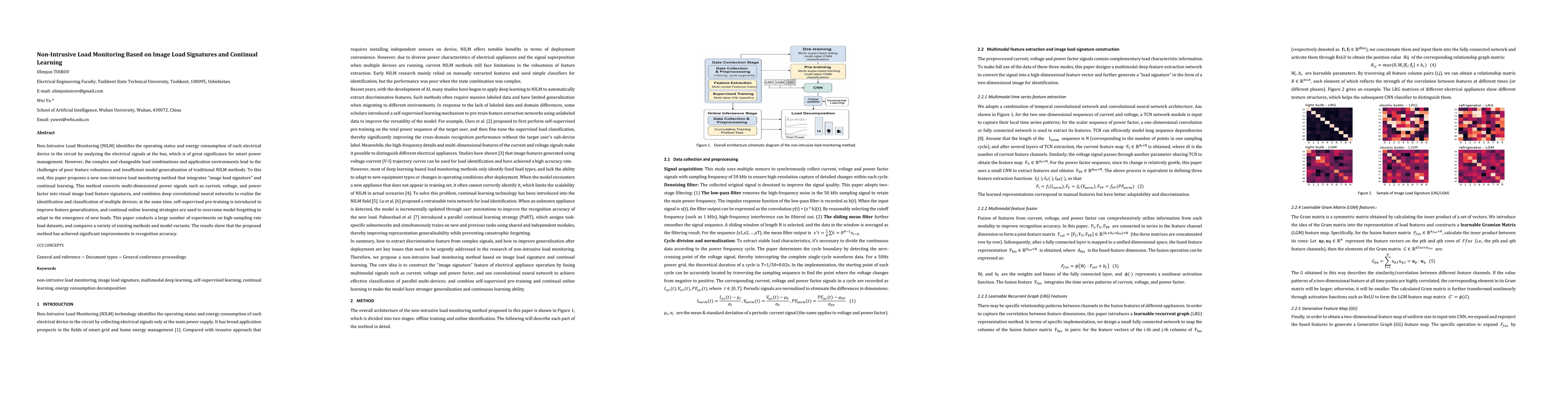 Non-Intrusive Load Monitoring (NILM) identifies the operating status and energy consumption of each electrical device in the circuit by analyzing the electrical signals at the bus, which is of great significance for smart power management. However, the complex and changeable load combinations and application environments lead to the challenges of poor feature robustness and insufficient model generalization of traditional NILM methods. To this end, this paper proposes a new non-intrusive load monitoring method that integrates "image load signature" and continual learning. This method converts multi-dimensional power signals such as current, voltage, and power factor into visual image load feature signatures, and combines deep convolutional neural networks to realize the identification and classification of multiple devices; at the same time, self-supervised pre-training is introduced to improve feature generalization, and continual online learning strategies are used to overcome model forgetting to adapt to the emergence of new loads. This paper conducts a large number of experiments on high-sampling rate load datasets, and compares a variety of existing methods and model variants. The results show that the proposed method has achieved significant improvements in recognition accuracy.