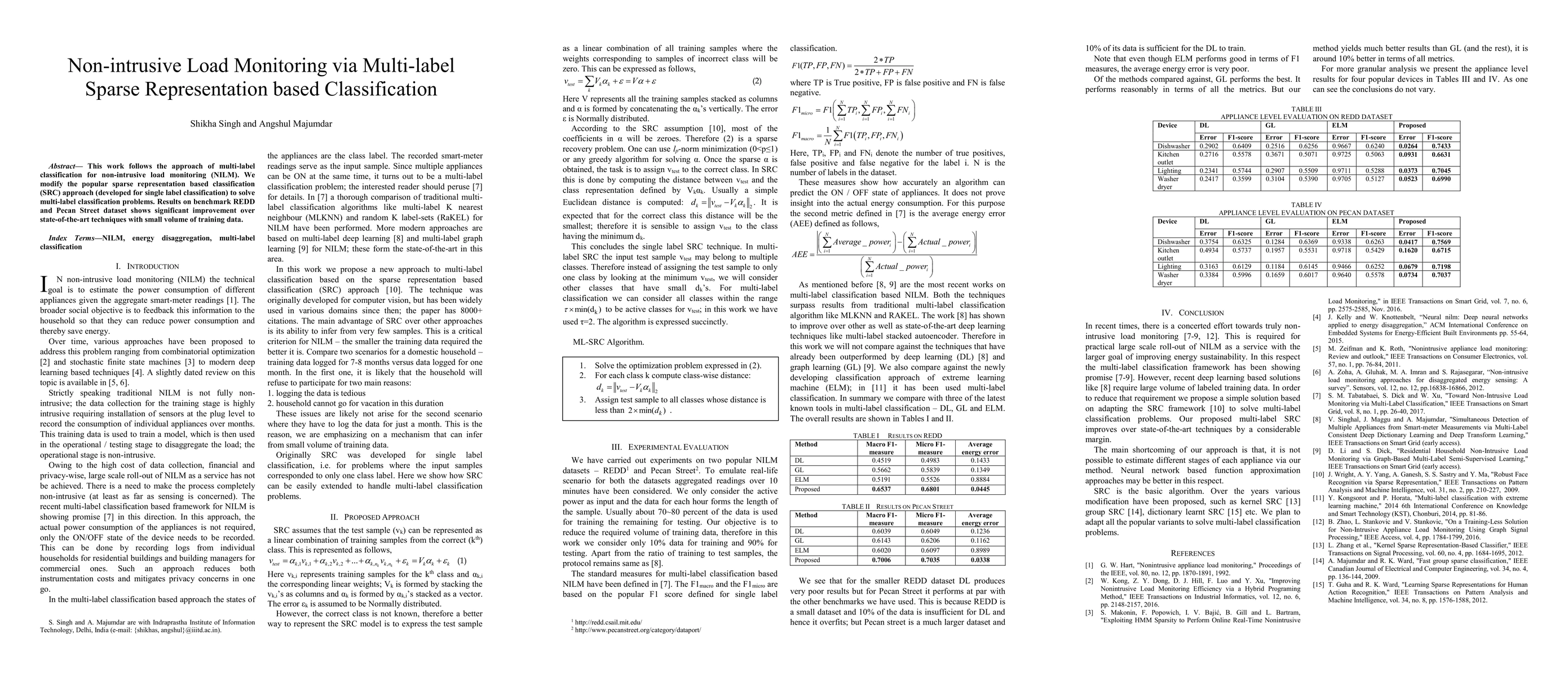 This work follows the approach of multi-label classification for non-intrusive load monitoring (NILM). We modify the popular sparse representation based classification (SRC) approach (developed for single label classification) to solve multi-label classification problems. Results on benchmark REDD and Pecan Street dataset shows significant improvement over state-of-the-art techniques with small volume of training data.